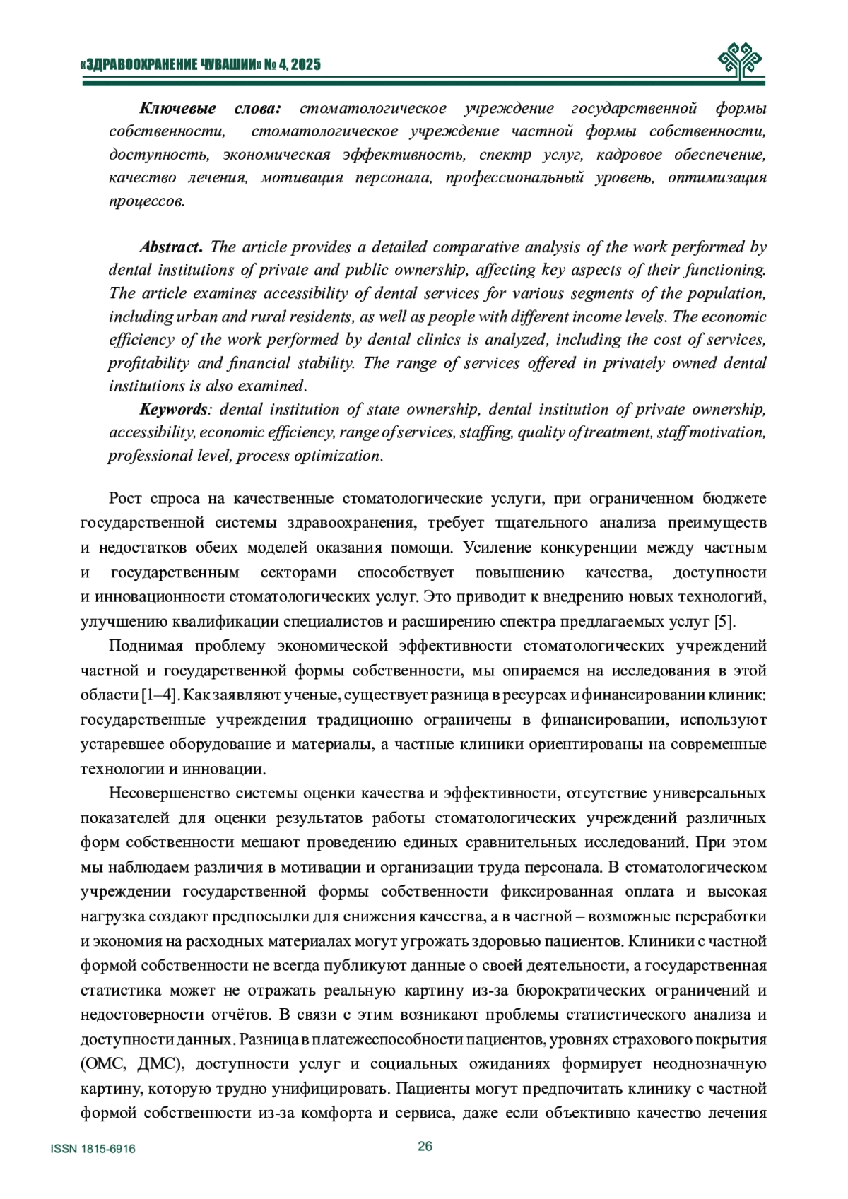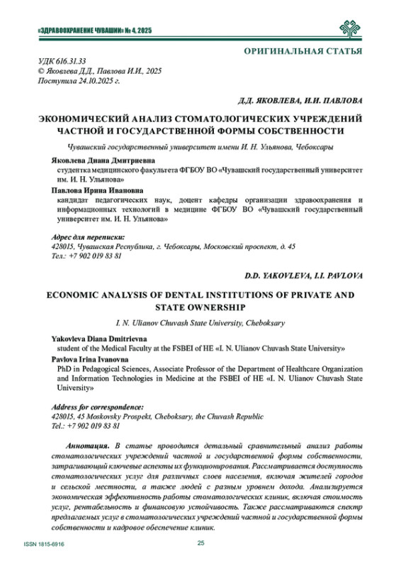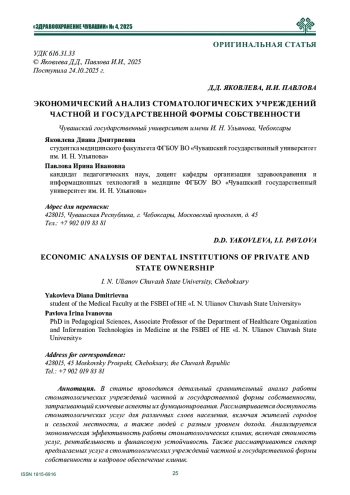 В статье проводится детальный сравнительный анализ работы стоматологических учреждений частной и государственной формы собственности, затрагивающий ключевые аспекты их функционирования. Рассматривается доступность стоматологических услуг для различных слоев населения, включая жителей городов и сельской местности, а также людей с разным уровнем дохода. Анализируется экономическая эффективность работы стоматологических клиник, включая стоимость услуг, рентабельность и финансовую устойчивость. Также рассматриваются спектр предлагаемых услуг в стоматологических учреждений частной и государственной формы собственности и кадровое обеспечение клиник.