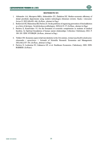 1. Ахмедов А.А. Медико-экономическая эффективность деятельности стоматологических ортопедических отделений современных технологий (Обзор литературы)// Наука и инновации. - 2022. Т. 1. - № 8. - С. 439-446.