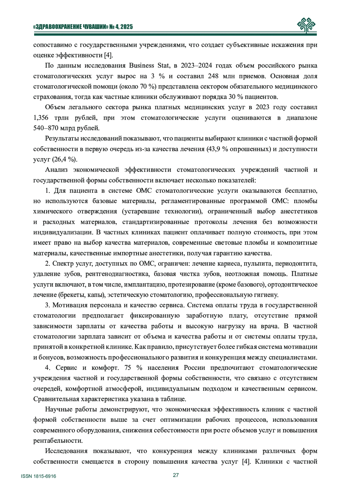 Рост спроса на качественные стоматологические услуги, при ограниченном бюджете государственной системы здравоохранения, требует тщательного анализа преимуществ и недостатков обеих моделей оказания помощи. Усиление конкуренции между частным и государственным секторами способствует повышению качества, доступности и инновационности стоматологических услуг. Это приводит к внедрению новых технологий, улучшению квалификации специалистов и расширению спектра предлагаемых услуг [5].