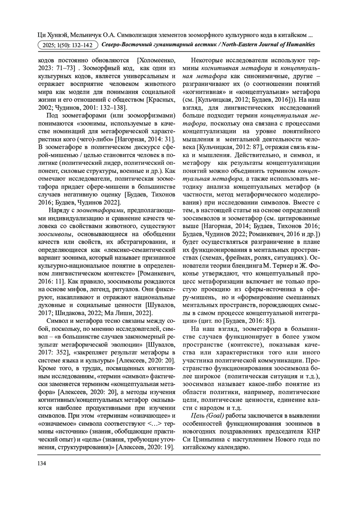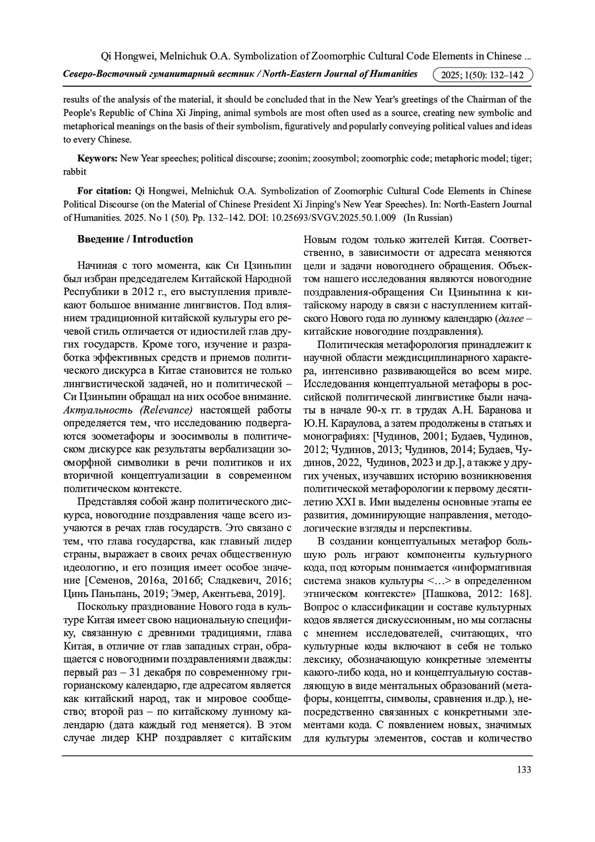 В традиционной китайской культуре зоонимы играют исключительную роль, являясь основополагающей частью древнекитайского зодиака. Зоонимы подчеркивают не только своеобразие языка и культуры, но и особенность китайской национальной картины мира. Данная работа посвящена функционированию элементов зооморфного культурного кода в новогодних поздравлениях-обращениях председателя КНР Си Цзиньпина в связи с наступлением Нового года по китайскому календарю. Научная новизна заключается в том, что поздравительные речи Си Цзиньпина в связи с китайским Новым годом не переведены на русский язык и в России еще не подвергались лингвистическим исследованиям, в частности, в плане использования зооморфного культурного кода. В результате исследования выявлено, что в китайских новогодних поздравлениях Си Цзиньпина чаще всего используются зоосимволы. На основе традиционных культурных метафорических и символических значений зоонимов в современном китайском политическом контексте создаются новые метафорические и символические значения.