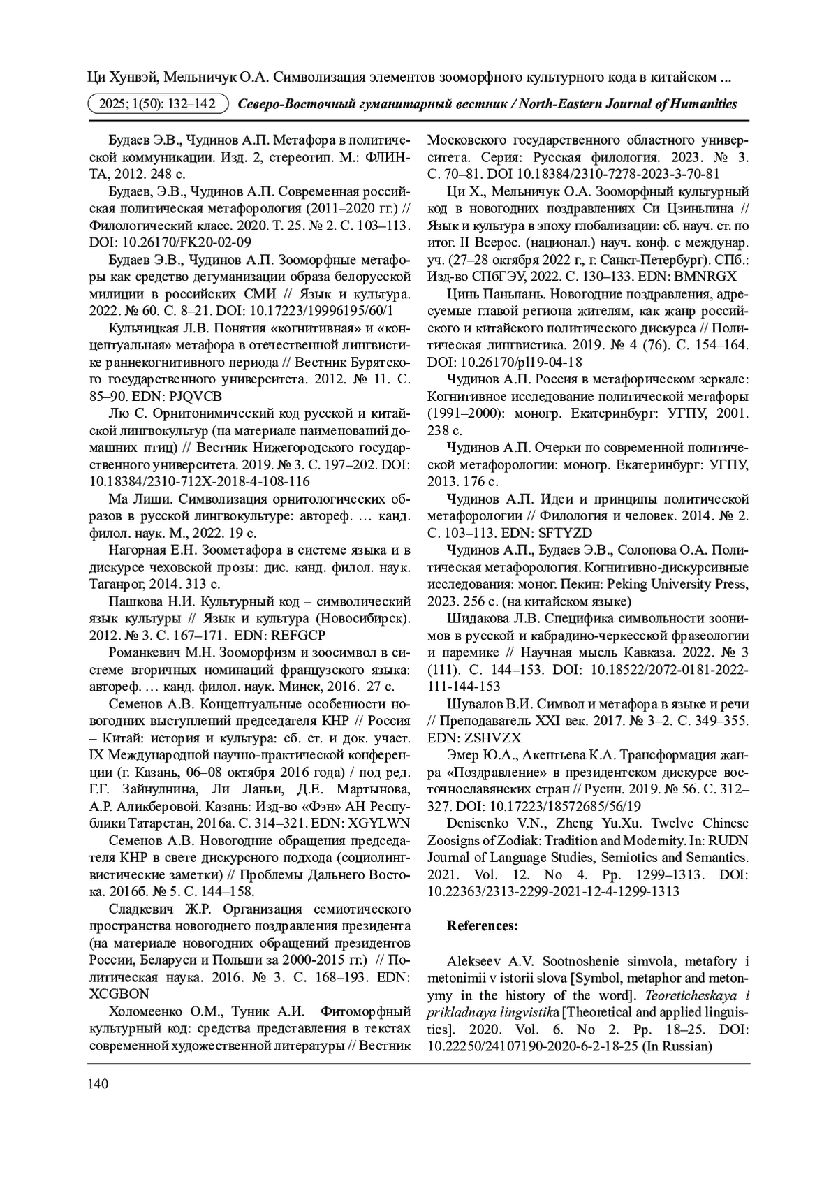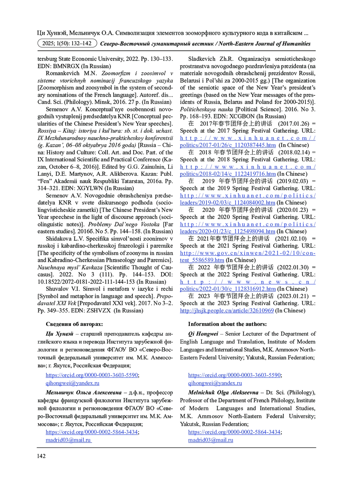16. Ци Х., Мельничук О.А. Зооморфный культурный код в новогодних поздравлениях Си Цзиньпина // Язык и культура в эпоху глобализации: сб. науч. ст. по итог. II Всерос. (национал.) науч. конф. с междунар. уч. (27-28 октября 2022 г., г. Санкт-Петербург). СПб.: Изд-во СПбГЭУ, 2022. С. 130-133. EDN: BMNRGX