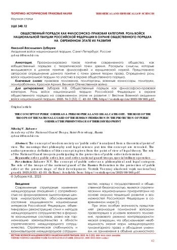 Проанализировано такое понятие современного общества, как «общественный порядок» с теоретической точки зрения. Раскрыты смыслы, которые вкладываются в данное понятие философией и юридической наукой. Представлено авторское определение данного понятия с точки зрения теории права. Определена роль войск национальной гвардии по участию в охране общественного порядка.