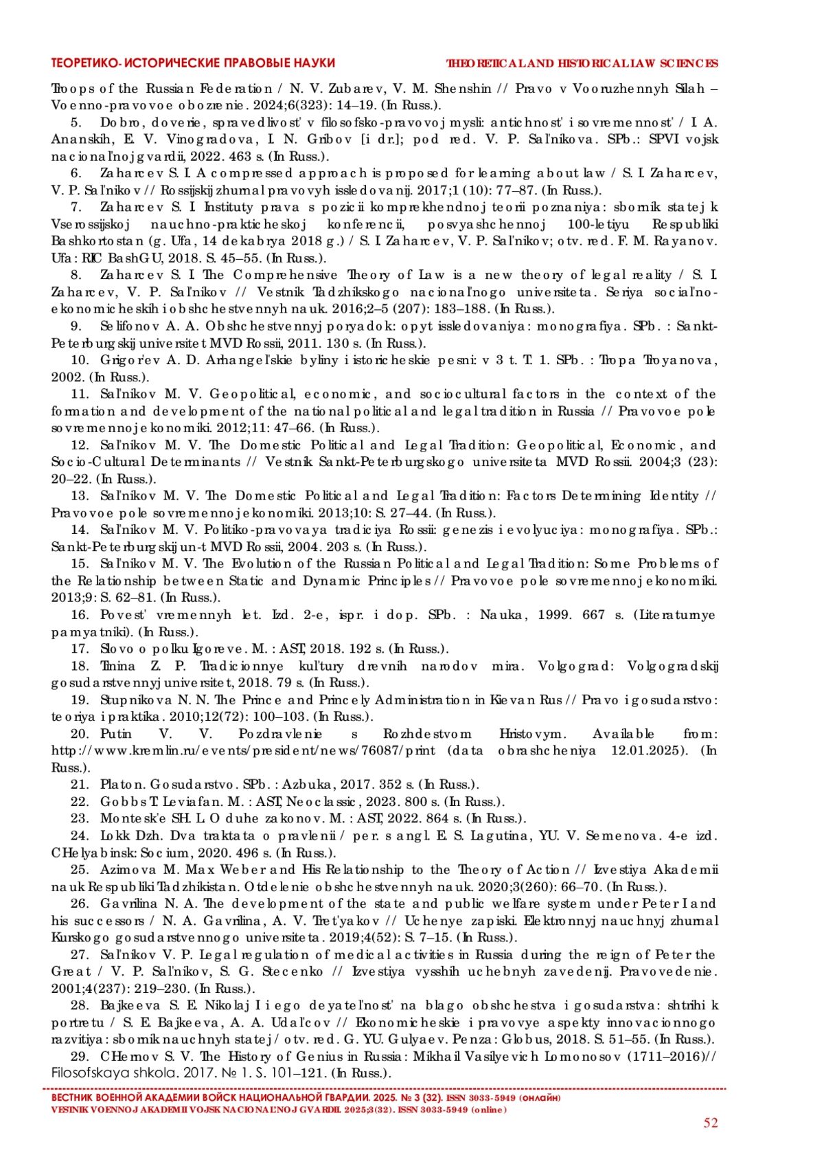 Sal’nikov M. V. Politiko-pravovaya tradiciya Rossii: genezis i evolyuciya: monografiya. SPb.: Sankt-Peterburgskij un-t MVD Rossii, 2004. 203 s. (In Russ.).