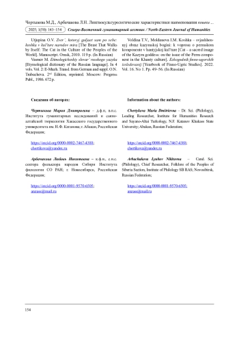 24. Хакасско-русский словарь / авторы-сост.: О.П. Анжиганова, Н.А. Баскаков и др.; под общ. ред. О.В. Субраковой. Новосибирск: Наука, 2006. 1114 с. Черная Кошка - защитница Казыма: Дневники Акель // Российский литературный портал: Проза.ру. 2013. URL: https://proza.ru/2013/03/02/1515 (дата обращения: 21.01.2025).