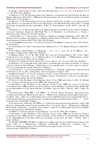 15. Синковец А. Ю. Организационно-правовые основы деятельности Ставки Верховного Главнокомандующего в начале Первой мировой войны (1914-1915 годы) // Вестник Полоцкого государственного университета/2017.№ 1.С.120-128.