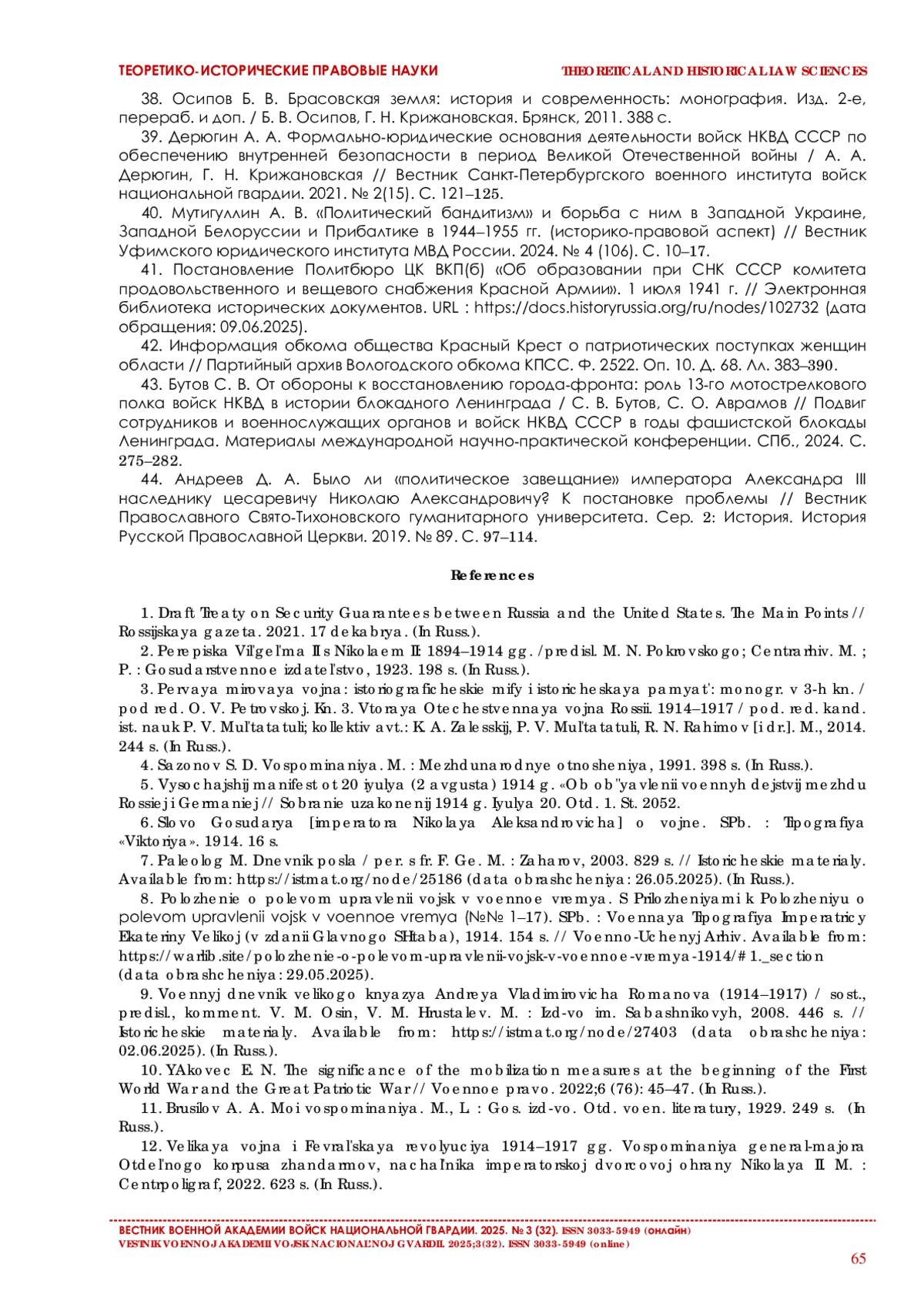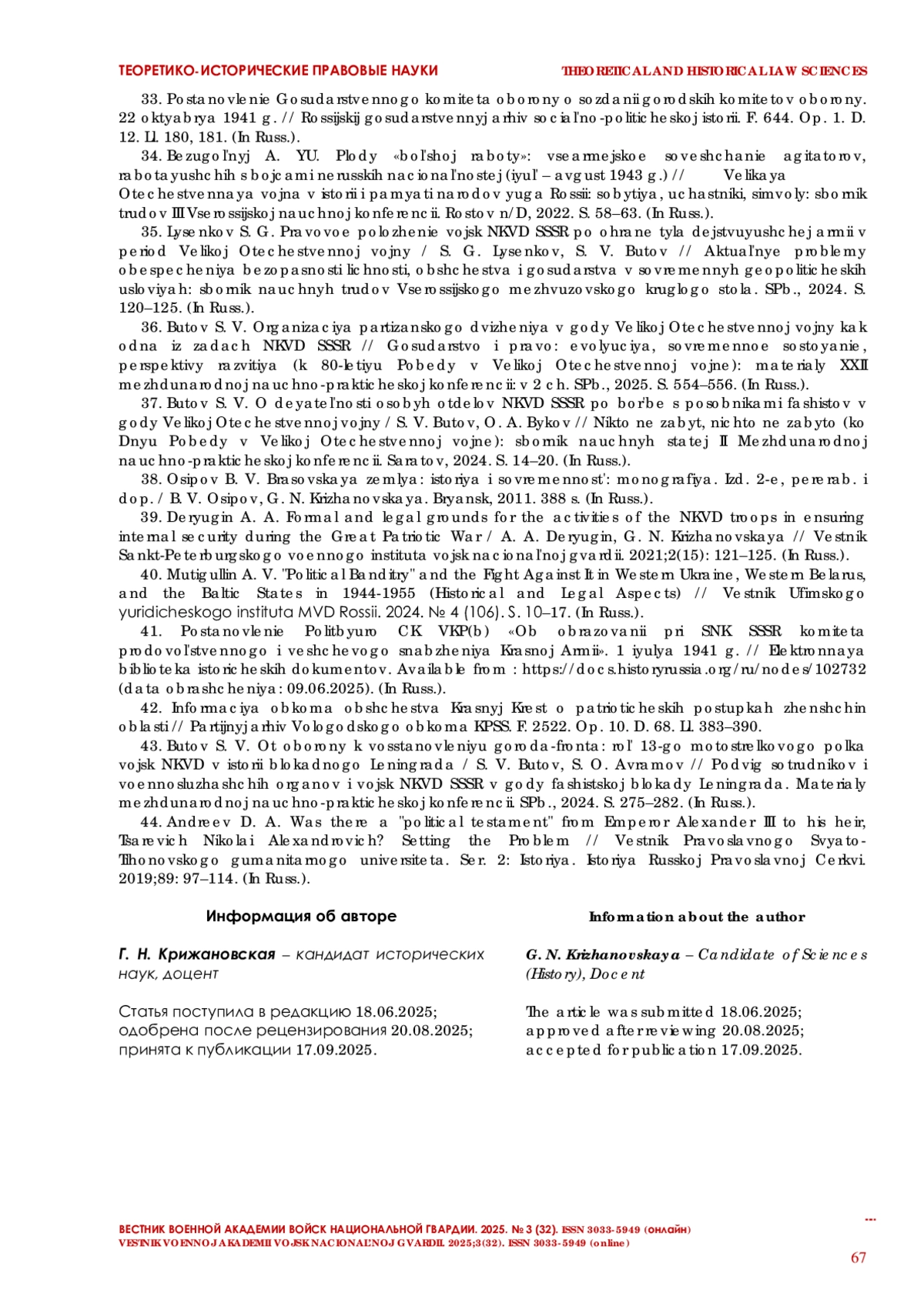 35. Лысенков С. Г. Правовое положение войск НКВД СССР по охране тыла действующей армии в период Великой Отечественной войны /// Актуальные проблемы обеспечения безопасности личности. СПб., 2024