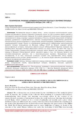 Человечество вошло в новую эпоху – эпоху создания многополярного мира. Страны коллективного Запада стремятся помешать этому за счет усиления своего диктата и насаждения неоколониальных порядков. В условиях невиданной эскалации международной напряженности взоры мировых лидеров прикованы к России, которая продолжает оставаться центром духовности и нравственности, местом сосредоточения традиционных ценностей, которая всегда демонстрировала и продолжает демонстрировать приверженность нормам международного права. Одним из направлений деятельности либеральных пропагандистов являются попытки «покушения» на Великую победу СССР во Второй мировой войне, фальсификация истории, отрицание зверств солдат «объединённой Европы», которые под руководством Адольфа Гитлера вероломно напали на нашу страну 22 июня 1941 года. В статье предпринята попытка комплексного анализа такого явления, как геноцид советского народа в Великой Отечественной войне. Делается вывод о том, что геноцид является как уголовно-наказуемым деянием, так и экзистенциальным вызовом, брошенным всему человечеству. И от того, насколько успешно сможет оно противостоять этому вызову, воздействовать на его истоки, детерминанты и т. д., во многом будет зависеть дальнейший ход развития человеческой цивилизации.