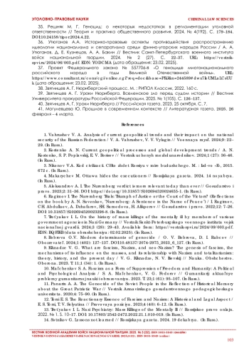 35. Решняк М. Г. Геноцид: о некоторых недостатках в регламентации уголовной ответственности // Теория и практика общественного развития. 2024. № 4(192). С. 179-184. DOI: 10.24158/tipor.2024.4.22