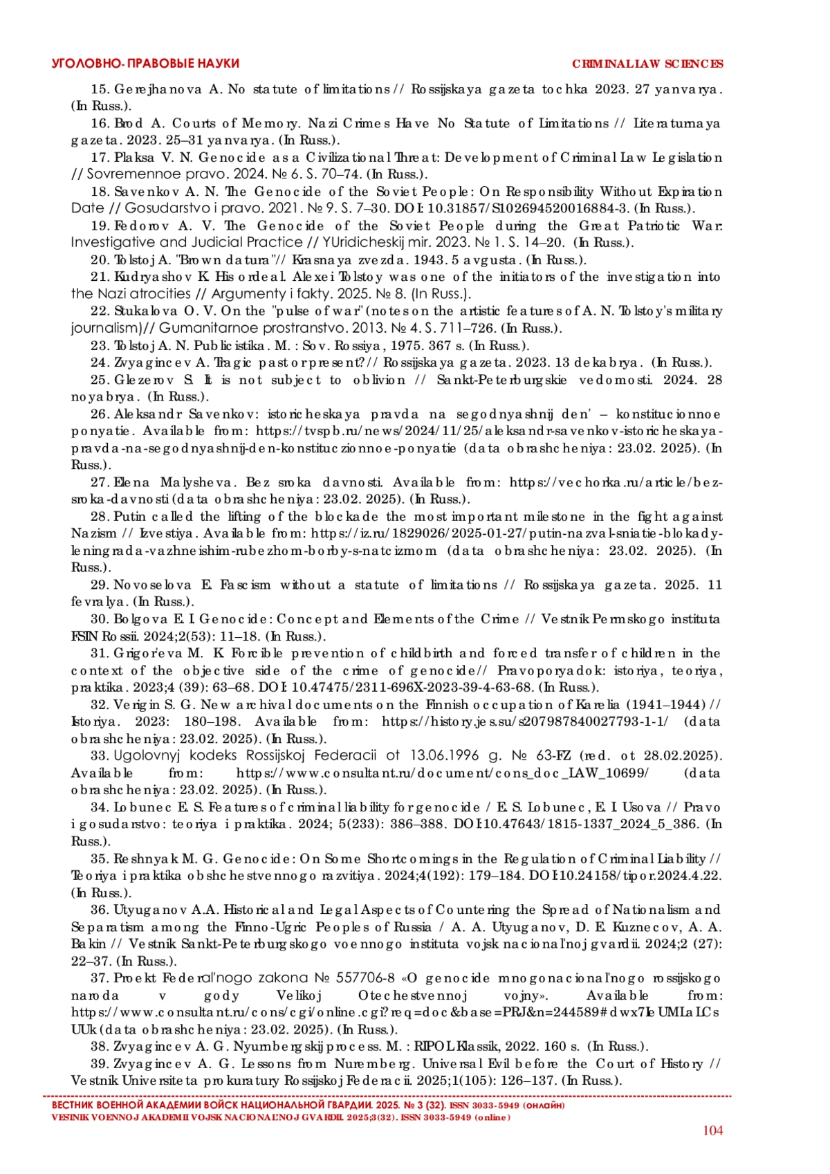 17. Плакса В. Н. Геноцид как цивилизационная угроза: развитие законодательства об уголовно-правовой ответственности // Современное право. 2024. № 6. С. 70-74.
