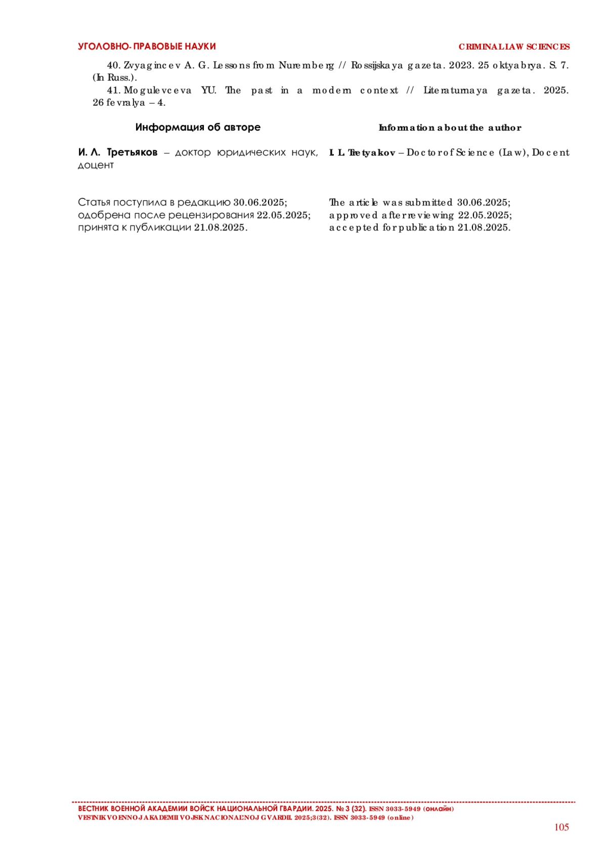 39. Звягинцев А. Г. Уроки Нюрнберга. Вселенское зло перед судом истории // Вестник Университета прокуратуры Российской Федерации. 2025. № 1(105). С. 126-137.
