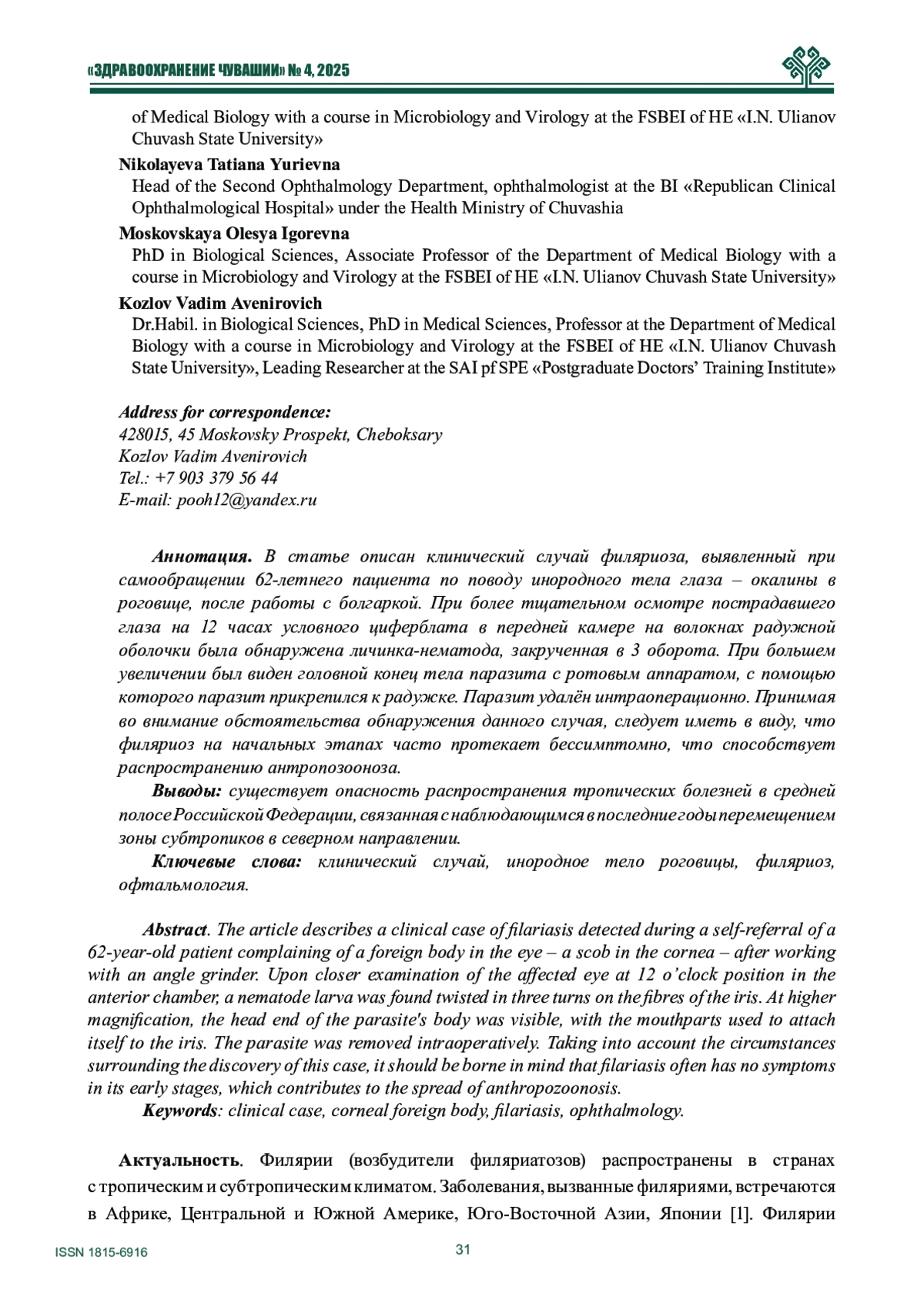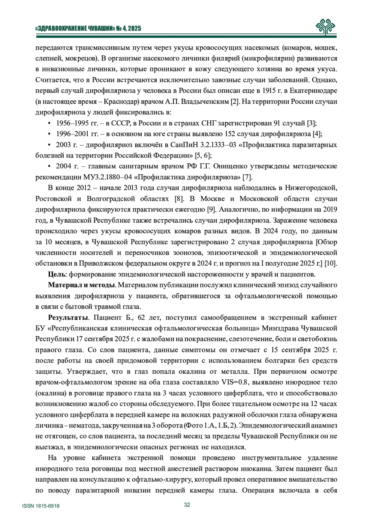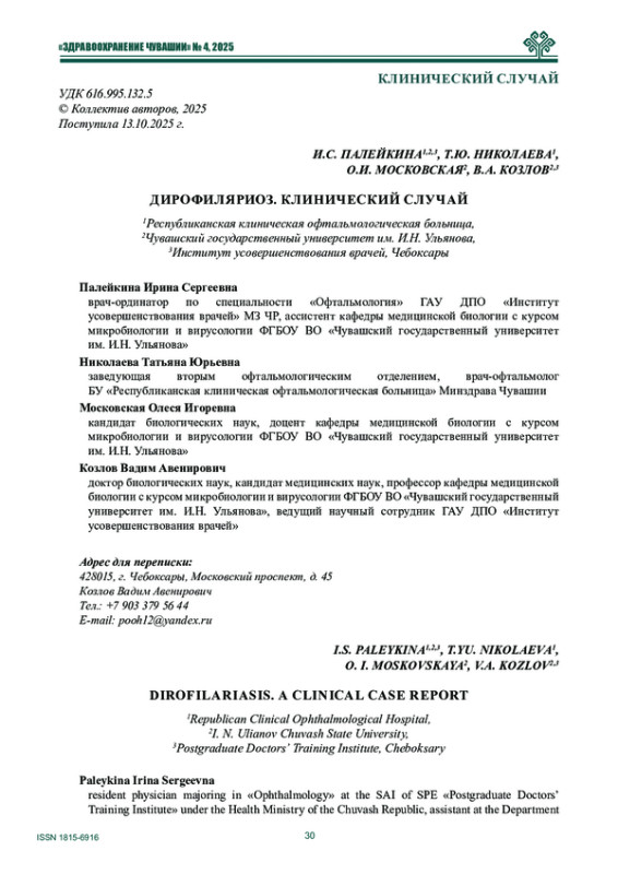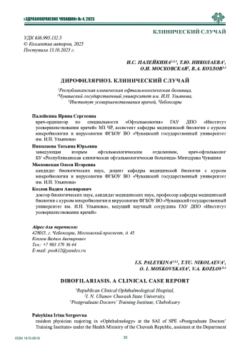 8. Зумбулидзе Н.Г., Коненкова Я.С., Ласкин А.В., Касаткина О.М., Белов Д.Ф., Вигонюк Д.В. Дирофиляриоз органа зрения: учащение случаев инвазии в областях с умеренным климатом. Офтальмологические ведомости. - 2019. - № 12(4). - С. 101-106. -. DOI: 10.17816/OV17731