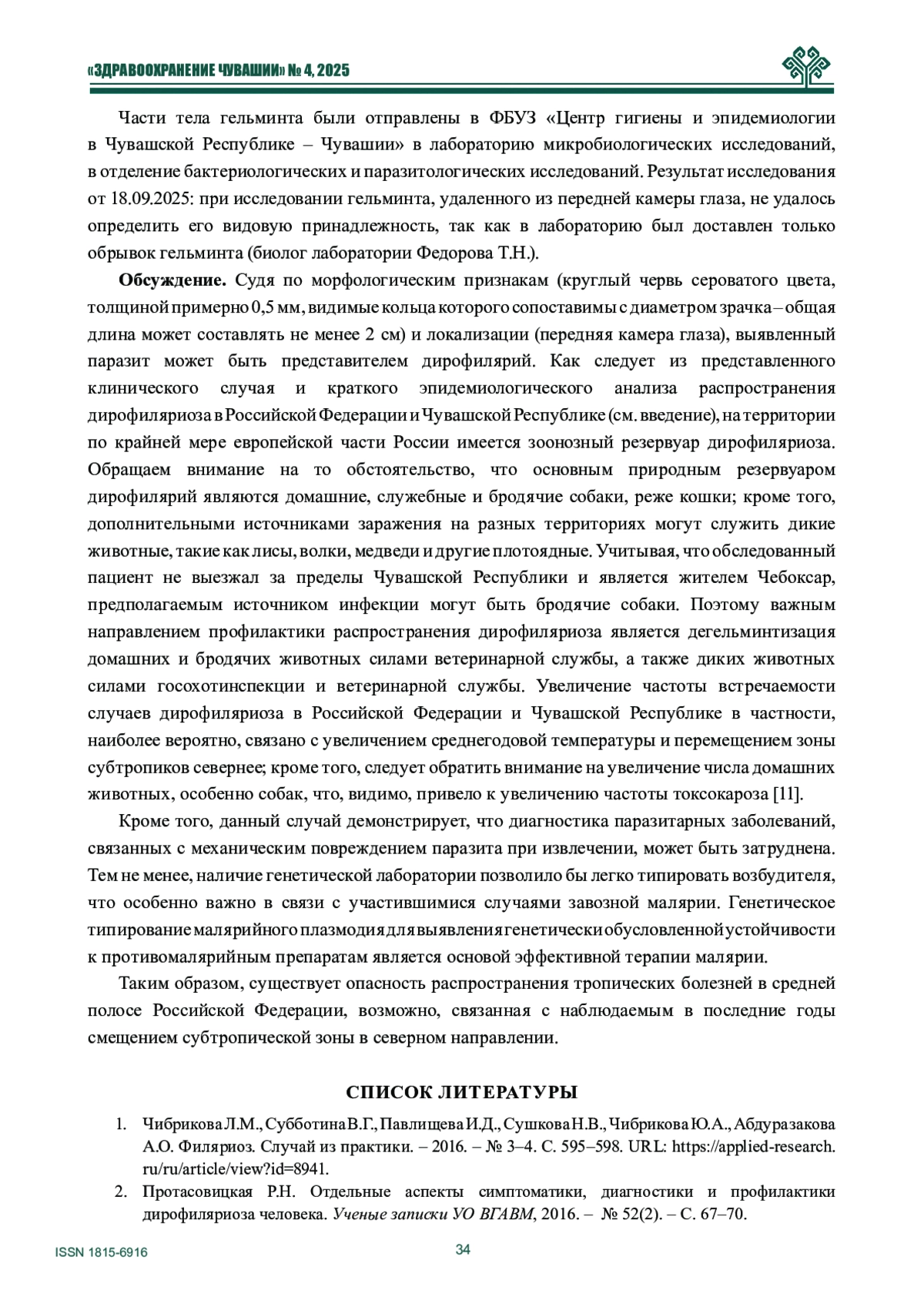 2. Протасовицкая Р.Н. Отдельные аспекты симптоматики, диагностики и профилактики дирофиляриоза человека. Ученые записки УО ВГАВМ, 2016. - № 52(2). - С. 67-70.