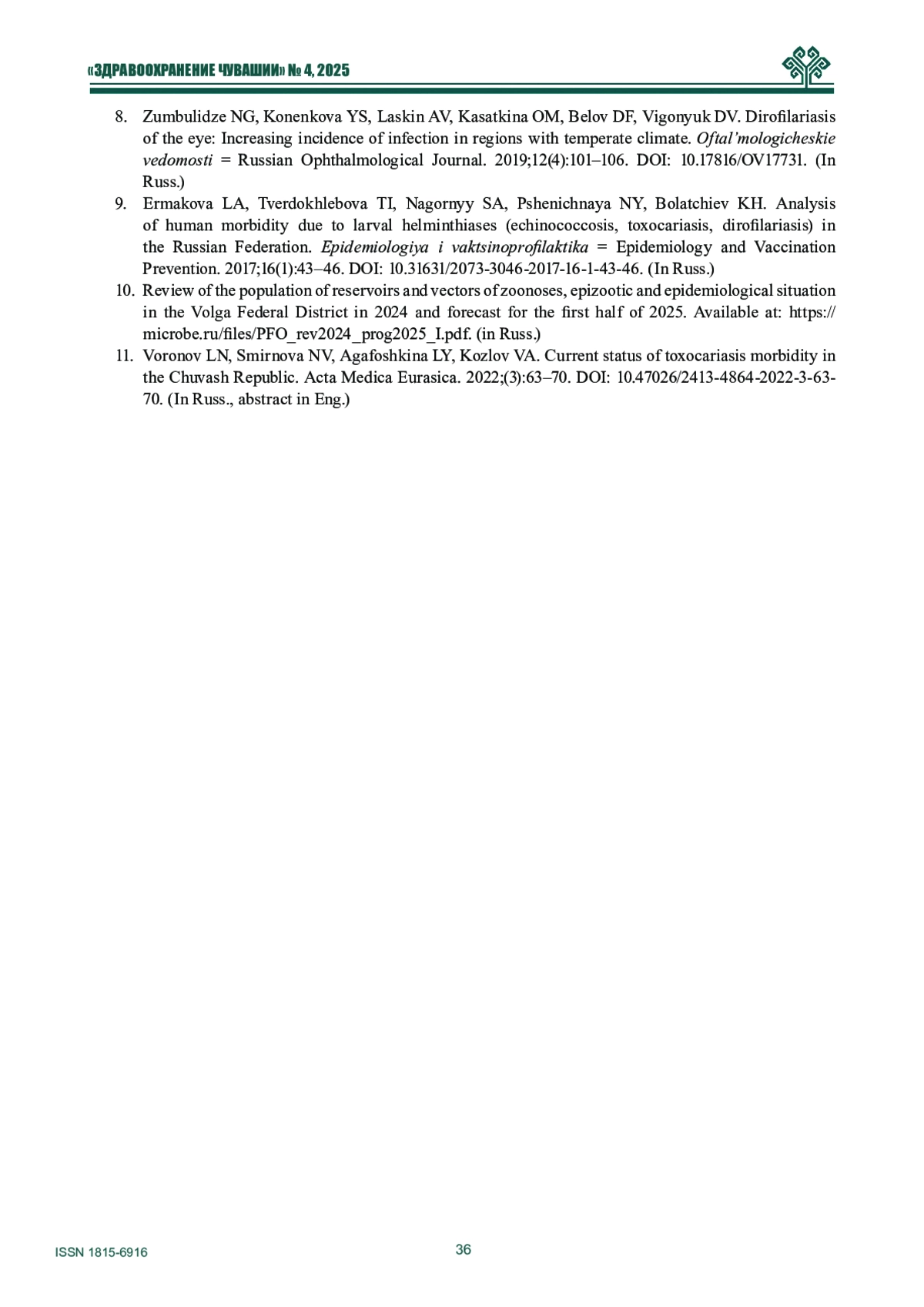 11. Воронов Л.Н., Смирнова Н.В., Агафошкина Л.Ю., Козлов В.А. Современное состояние заболеваемости токсокарозом в Чувашской Республике. Acta Medica Eurasica. - 2022. - № 3. С. 63-70. -. DOI: 10.47026/2413-4864-2022-3-63-70