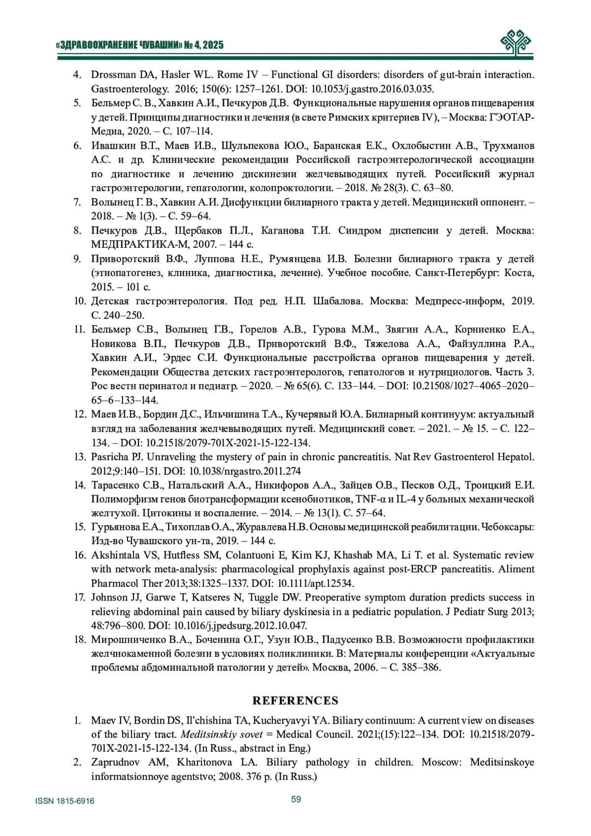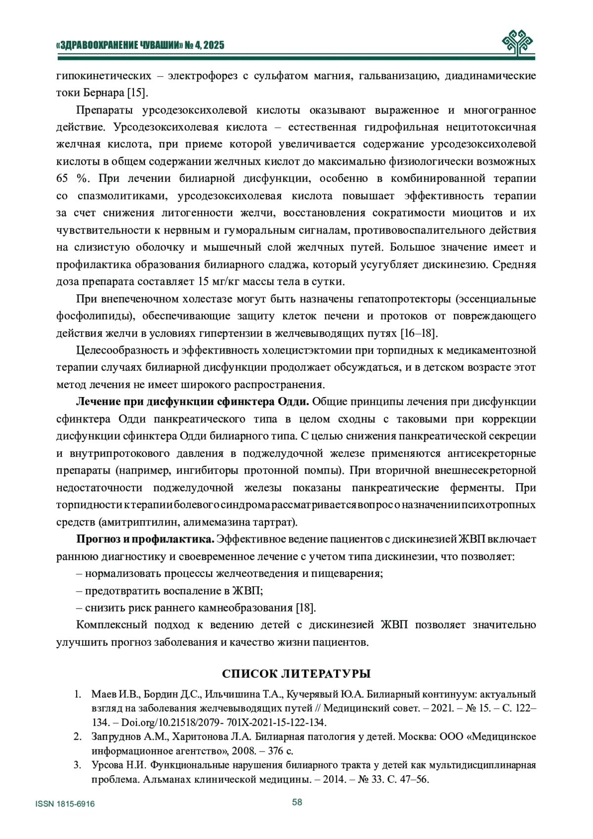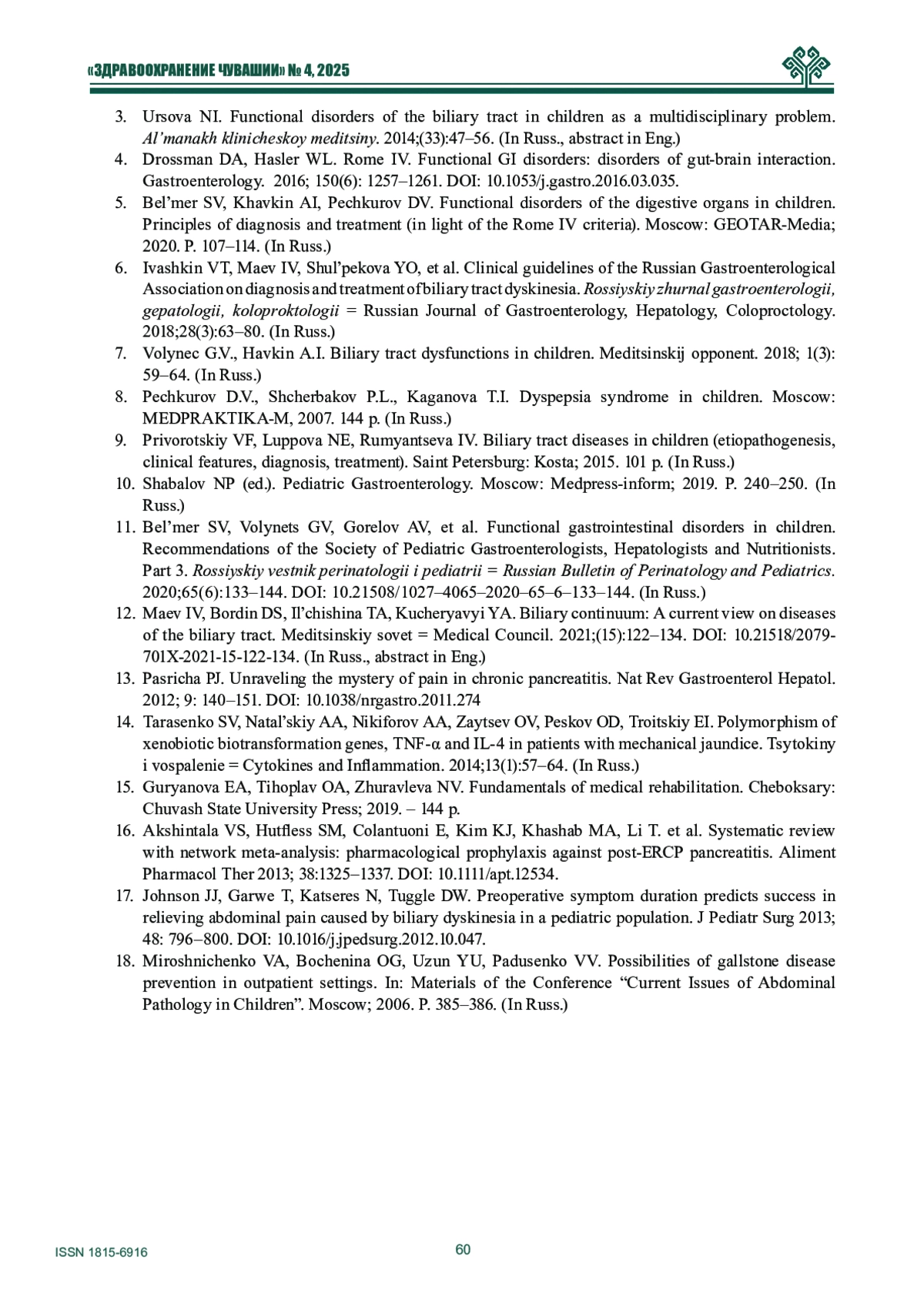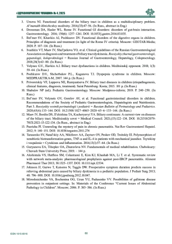 3. Урсова Н.И. Функциональные нарушения билиарного тракта у детей как мультидисциплинарная проблема. Альманах клинической медицины. - 2014. - № 33. С. 47-56.