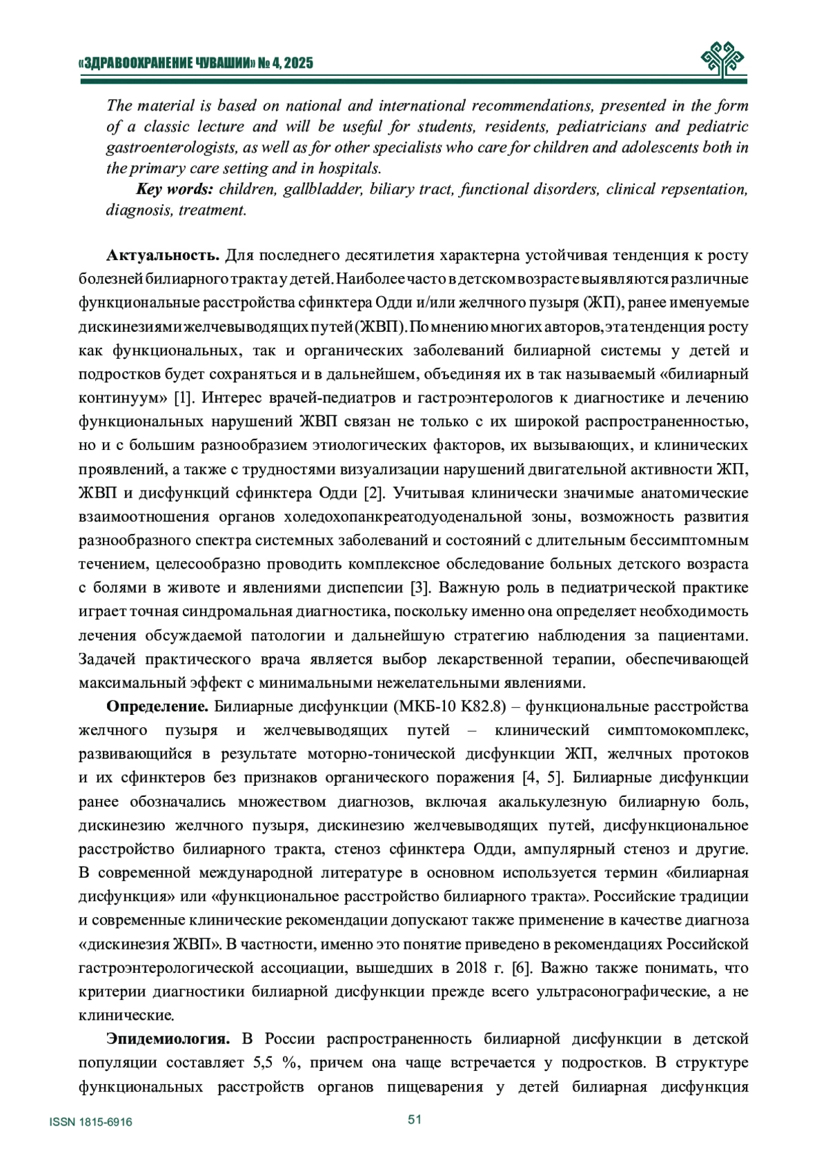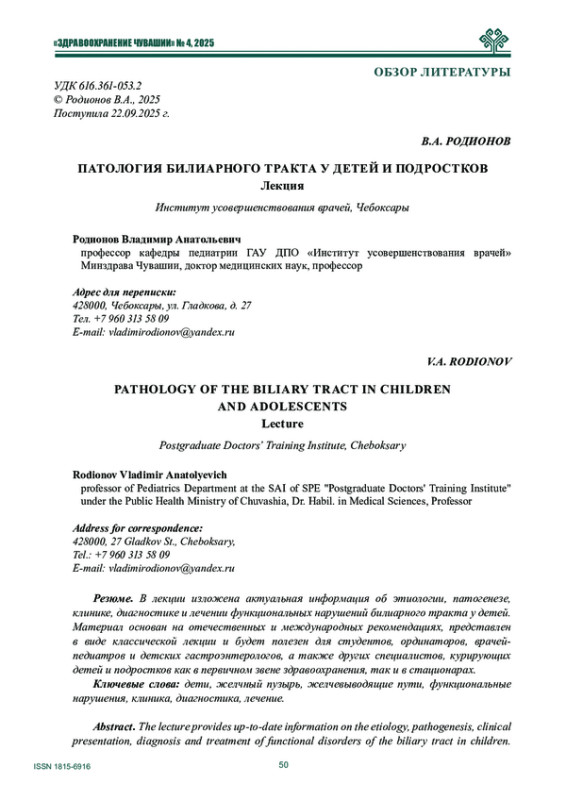 В лекции изложена актуальная информация об этиологии, патогенезе, клинике, диагностике и лечении функциональных нарушений билиарного тракта у детей. Материал основан на отечественных и международных рекомендациях, представлен в виде классической лекции и будет полезен для студентов, ординаторов, врачейпедиатров и детских гастроэнтерологов, а также других специалистов, курирующих детей и подростков как в первичном звене здравоохранения, так и в стационарах.