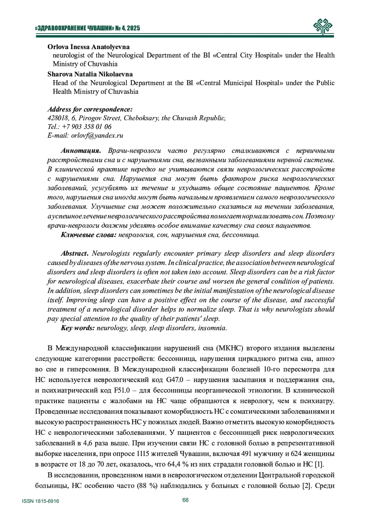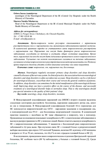 В Международной классификации нарушений сна (МКНС) второго издания выделены следующие категориии расстройств: бессонница, нарушения циркадного ритма сна, апноэ во сне и гиперсомния. В Международной классификации болезней 10-го пересмотра для НС используется неврологический код G47.0 – нарушения засыпания и поддержания сна, и психиатрический код F51.0 – для бессонницы неорганической этиологии. В клинической практике пациенты с жалобами на НС чаще обращаются к неврологу, чем к психиатру. Проведенные исследования показывают коморбидность НС с соматическими заболеваниями и высокую распространенность НС у пожилых людей. Важно отметить высокую коморбидность НС с неврологическими заболеваниями. У пациентов с бессонницей риск неврологических заболеваний в 4,6 раза выше. При изучении связи НС с головной болью в репрезентативной выборке населения, при опросе 1115 жителей Чувашии, включая 491 мужчину и 624 женщины в возрасте от 18 до 70 лет, оказалось, что 64,4 % из них страдали головной болью и НС [1].