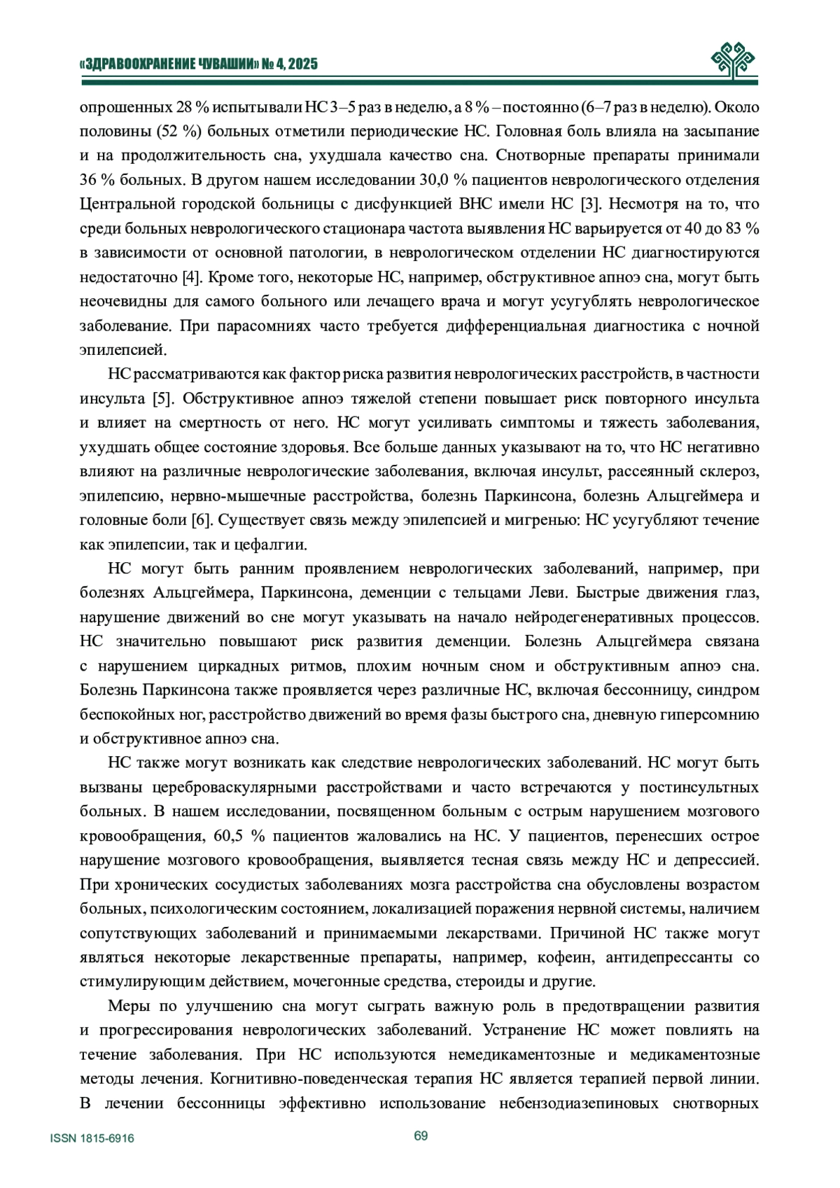 4. Полуэктов М.Г., Русакова И.М., Левин Я.И. Оценка распространенности нарушений сна среди больных неврологического стационара // Журнал неврологии и психиатрии, 2009. Т. 109. - № 4. - С. 59-62.