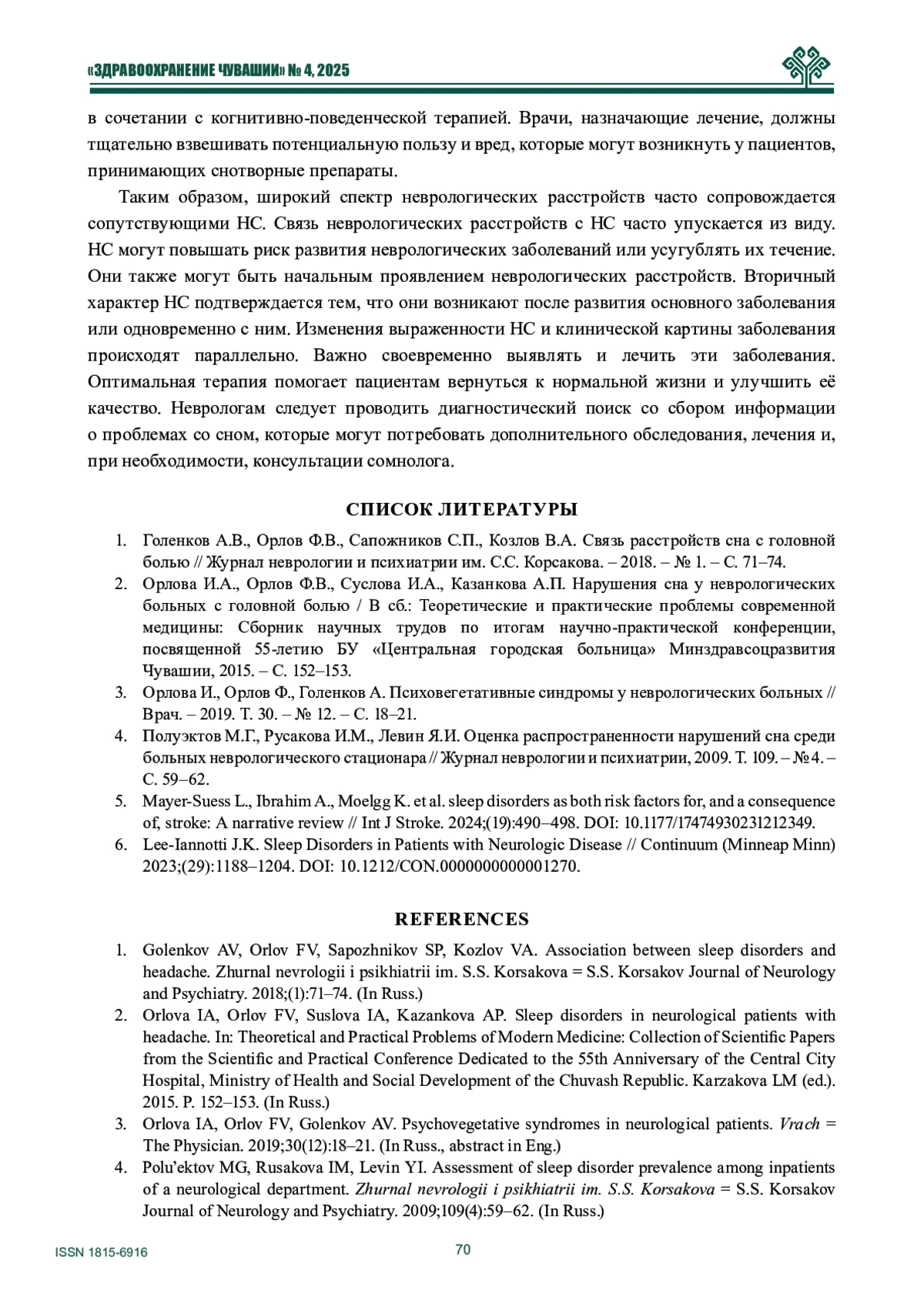 1. Голенков А.В., Орлов Ф.В., Сапожников С.П., Козлов В.А. Связь расстройств сна с головной болью // Журнал неврологии и психиатрии им. С.С. Корсакова. - 2018. - № 1. - С. 71-74.