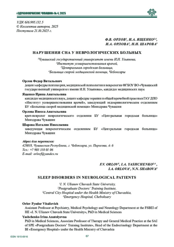 2. Орлова И.А., Орлов Ф.В., Суслова И.А., Казанкова А.П. Нарушения сна у неврологических больных с головной болью / В сб.: Теоретические и практические проблемы современной медицины: Сборник научных трудов по итогам научно-практической конференции, посвященной 55-летию БУ “Центральная городская больница” Минздравсоцразвития Чувашии, 2015. - С. 152-153.