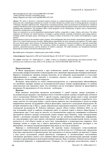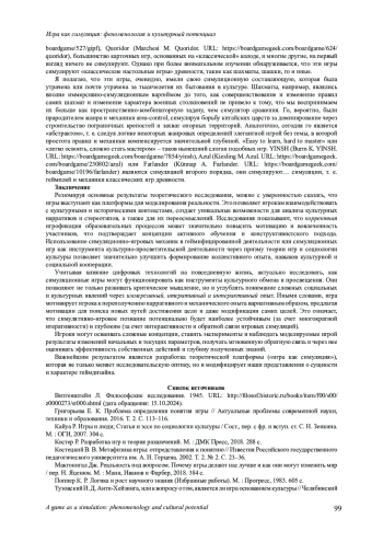 Статья посвящена теоретическому анализу игры как культурного феномена с целью выработки новых теоретических рамок и методологической платформы исследования. Автор определяет основные проблемные зоны уже сформировавшихся и устойчивых подходов: дескриптивной дефиниции Й. Хейзинга и терминологического пессимизма Л. Витгенштейна. Автор предлагает интерпретировать игры как метод познания и отражения мира, реализуемый через симуляции первого (отражение объективной реальности) и второго (моделирование других симуляций) порядка. Выдвинутая гипотеза позволяет по-новому взглянуть на ключевые характеристик игр, таких как иммерсивность, интерактивность, симулятивность и диморфность. Игру рассматривается как до сих пор не неманифестированную эпистемологическую традицию, сопоставимую с магией, религией и наукой. Автор акцентирует внимание на динамике изменения игровых методов в историческом и культурном контексте, анализирует современные геймдизайнерские практики, включая модульные и «legacy»-игры, демонстрируя эволюцию участия игроков в создании и модификации игровых систем. Особое внимание уделено симулятивной природе игр, которая отличается от имитационных характеристик, присущих, например, различным видам искусства. Игры моделируют процессы реальности, предоставляя игрокам возможность активного взаимодействия и познания. Автор утверждает, что даже абстрактные игры сохраняют элементы симуляции через их связь с историческими прототипами или являются симуляциями второго порядка (симуляцией симуляций). Итоговые выводы подтверждают значимость игр как платформ для анализа культурных нарративов, образовательных процессов и формирования коллективного опыта. Работа предлагает новые фундаментальные теоретические рамки для исследований в области культурной теории игр.