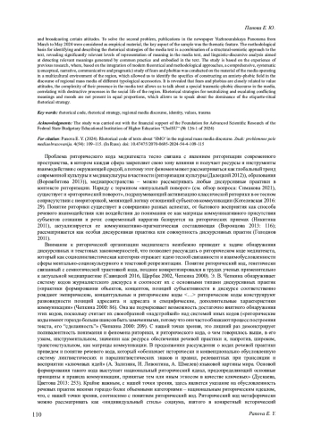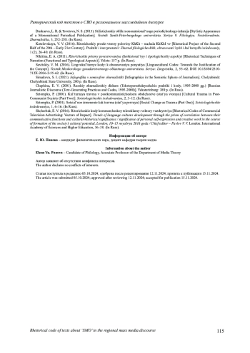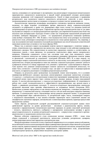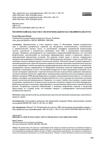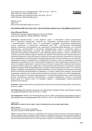 Приоритетными в статье являются задачи 1) обоснование понятия риторического кода и комплекса риторических стратегий как инструмента аксиологического, семантического и лингвистического анализа текста, 2) рассмотрение специфики риторической репрезентации текстов, тематически и семантически касающихся темы СВО, в региональном массмедийном дискурсе. Медиатекст рассматривается как социальный и коммуникативный феномен в его текстовой репрезентации, «реагирующий» на актуальные информационные поводы и социальные запросы и транслирующий определенные установки. Для решения второй задачи в качестве эмпирического материала рассматривались публикации в газете «Южноуральская панорама» с марта по май 2024 года, ключевым аспектом выборки являлся тематический признак. Методологической основой выявления и описания риторических стратегий медиатекста является сочетание структурно-семиотического подхода к тексту, выявляющего значимо-релевантные уровни репрезентации смысла в медиатексте, и лингвистико-дискурсивного анализа, направленного на обнаружение актуальных смыслов, порожденных узуальной практикой и воплощенных в тексте. Исследование базируется на опыте предыдущих изысканий, где на основе интеграции современных теоретико-методологических подходов было проведено комплексное, системное (концептологическое, нарративное, коммуникативно-прагматическое) исследование страхов и фобий на материале СМИ, функционирующих в условиях поликультурной среды области, что позволило выявить специфику конструирования тревожно-фобического поля в дискурсе региональных массмедиа разной типологической принадлежности. Выявлено, что страхи и фобии тесно связаны с ценностными установками, комплексность их присутствия в медиатексте позволяет говорить об особом травмирующе- фобическом дискурсе в массмедиа, коррелирующем с деструктивными процессами в социальной жизни региона. Риторические стратегии нейтрализации и эскалации конфликтных смыслов и настроений присутствуют не в равных долях, что позволяет говорить о доминировании этикетно-ритуальной риторической стратегии.
