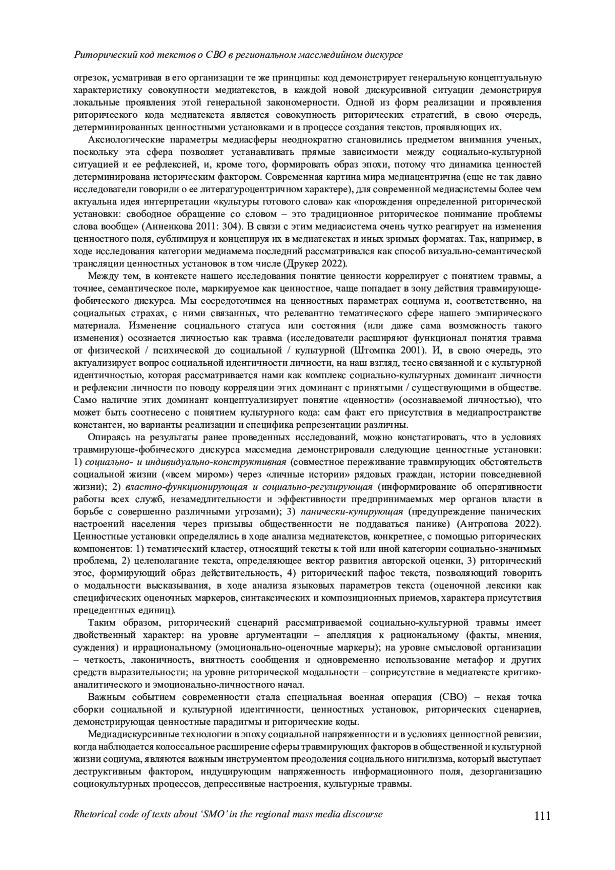 2. Антропова В. В. Травмирующе-фобический дискурс в региональных СМИ: речевые стратегии репрезентации ценностей // Динамика медиасистем. 2022. Т. 2. С. 16-25. EDN: FBHRTE