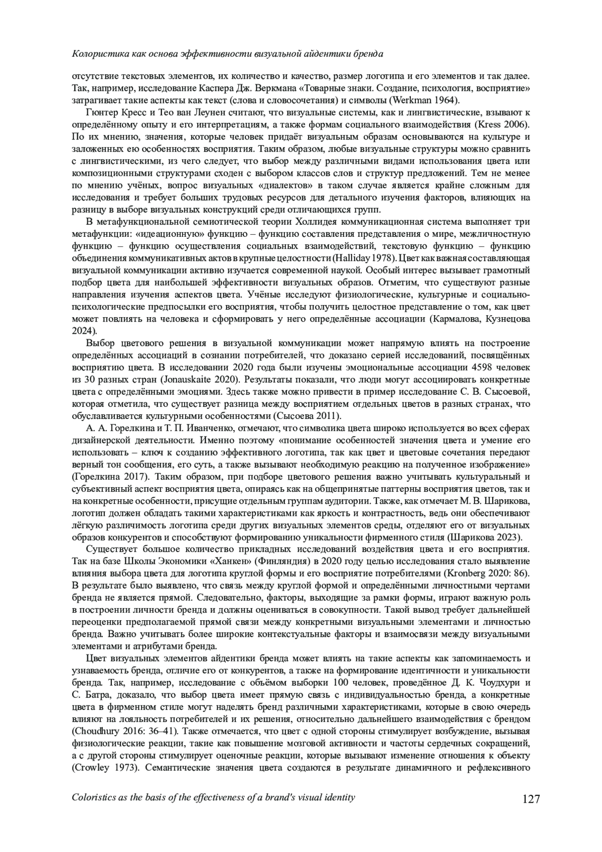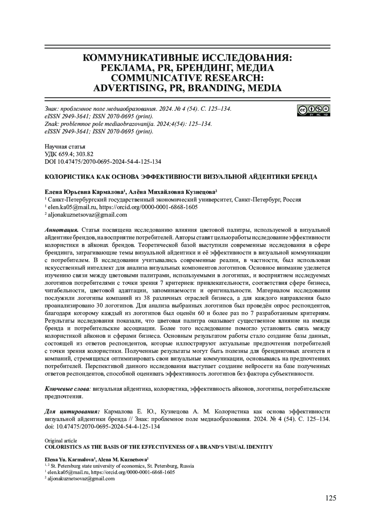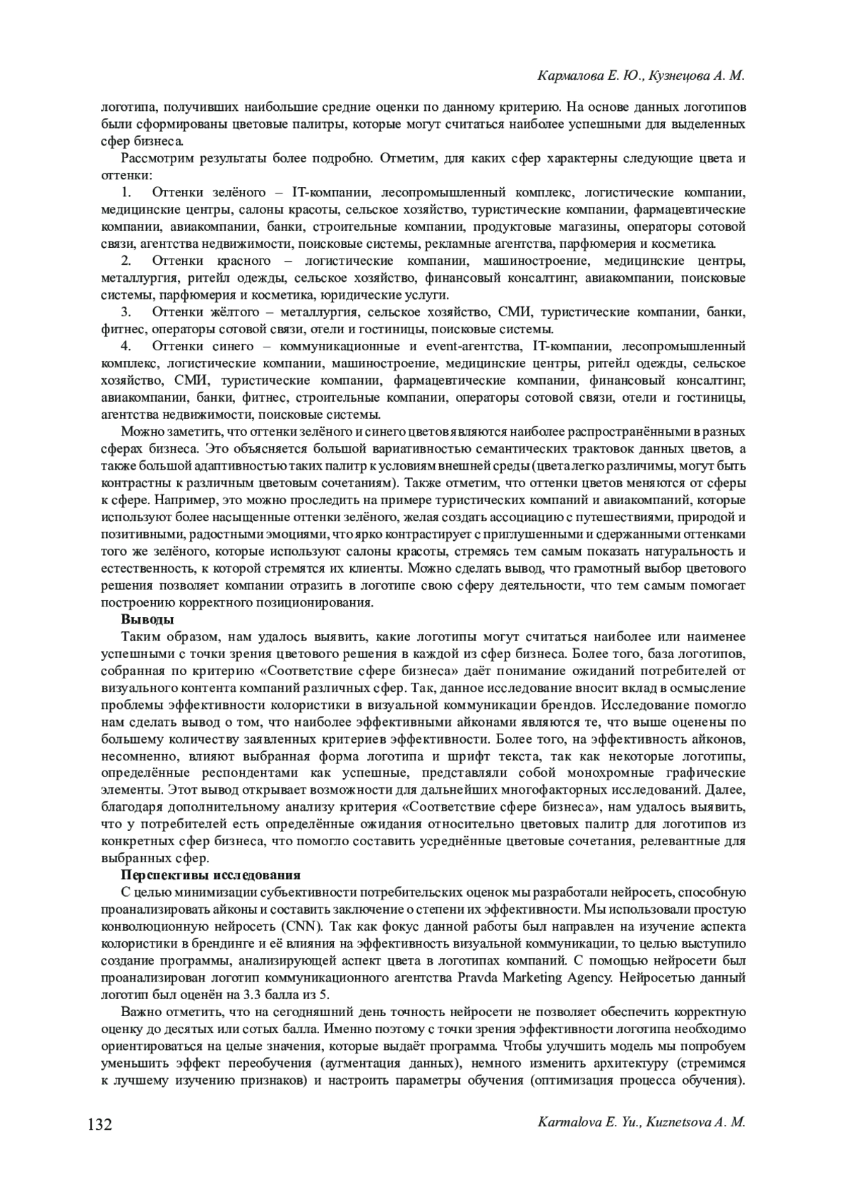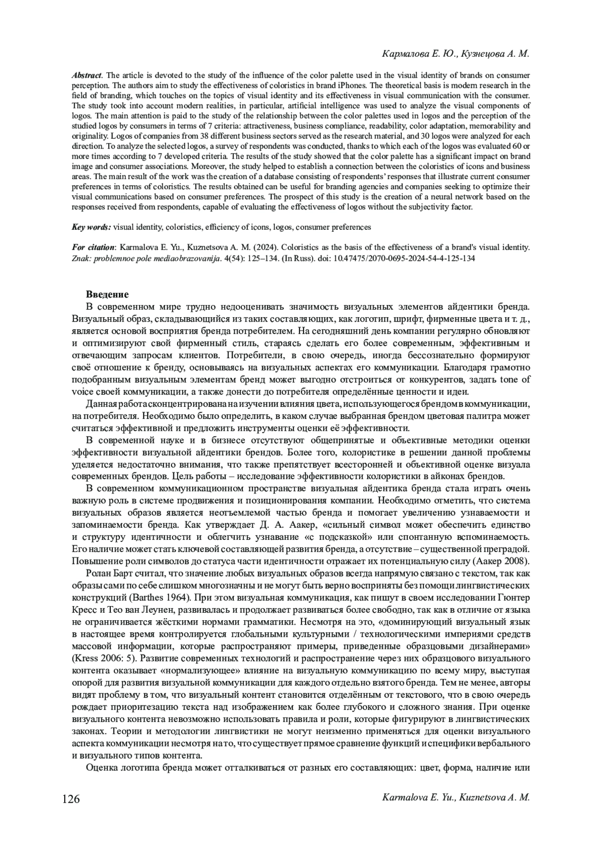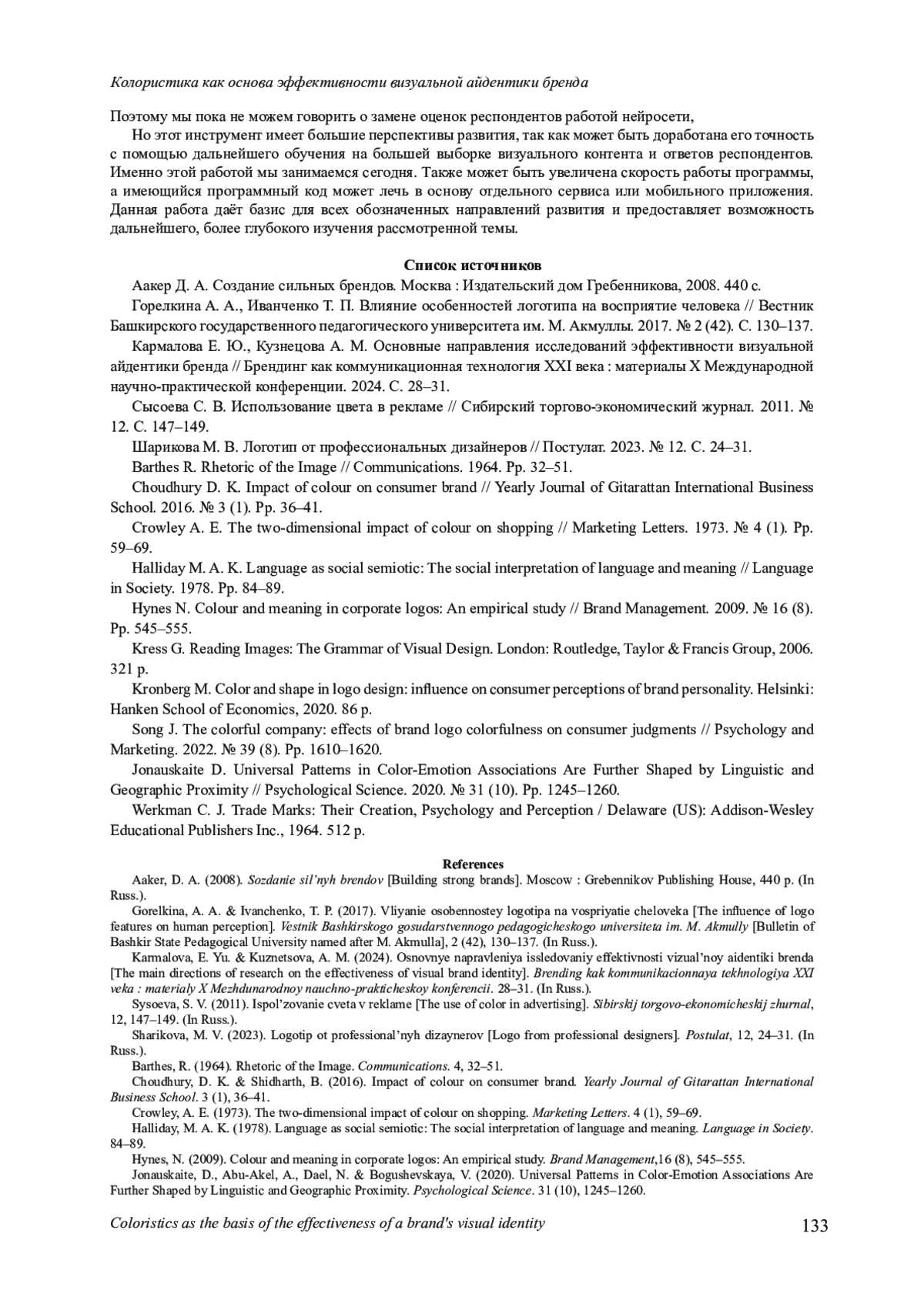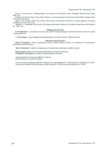 3. Кармалова Е. Ю., Кузнецова А. М. Основные направления исследований эффективности визуальной айдентики бренда // Брендинг как коммуникационная технология XXI века: материалы X Международной научно-практической конференции. 2024. С. 28-31. EDN: ALPCUS