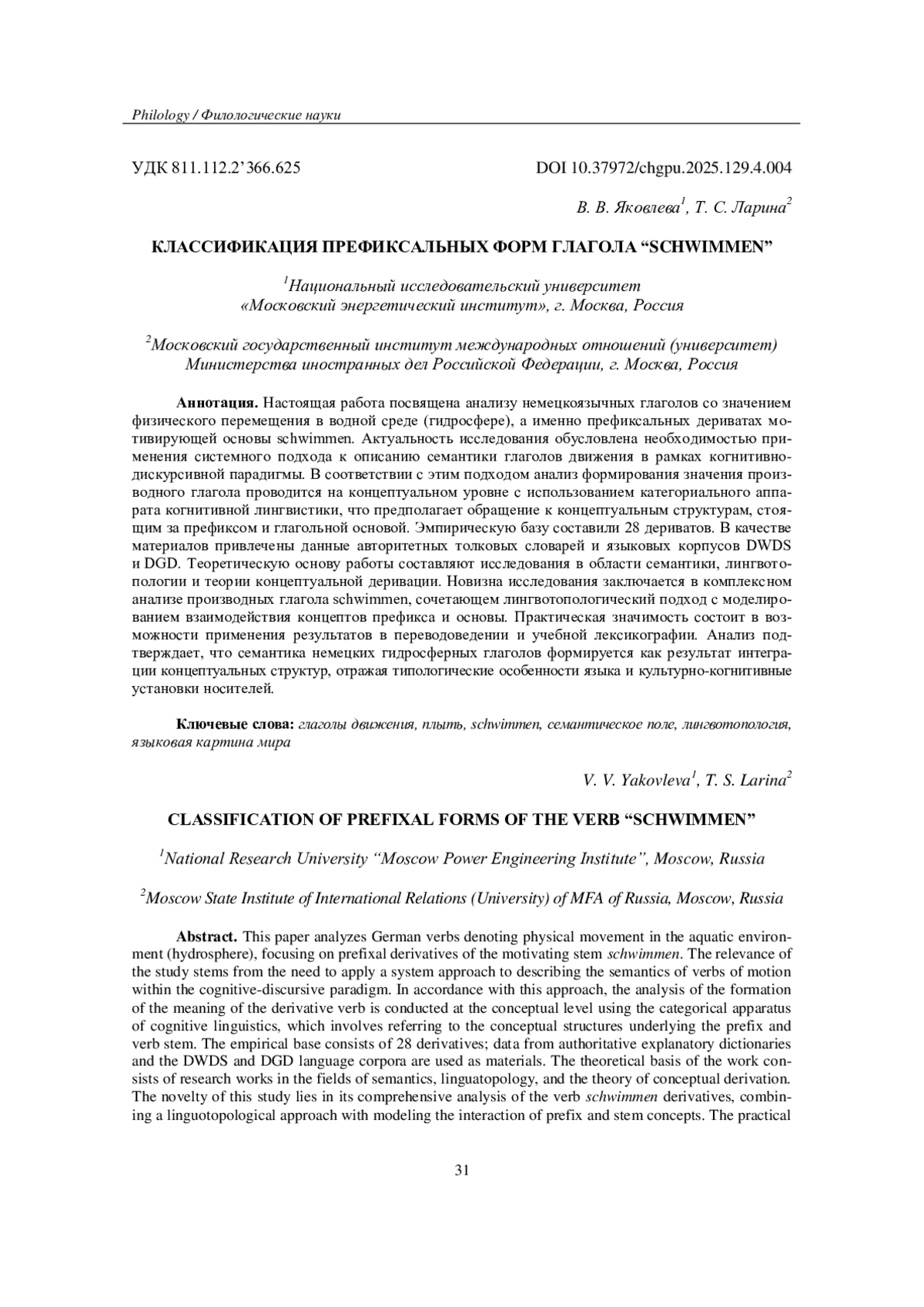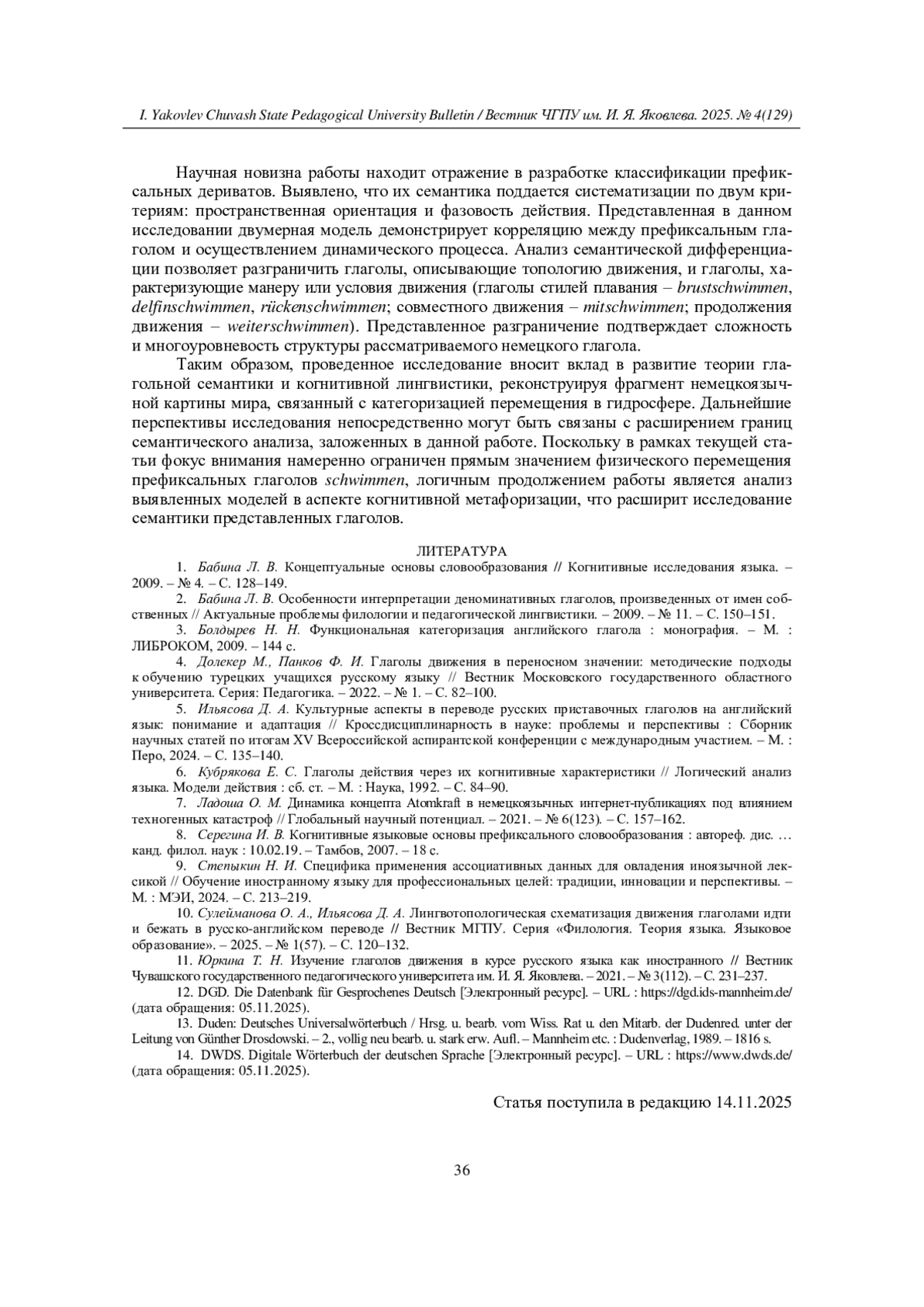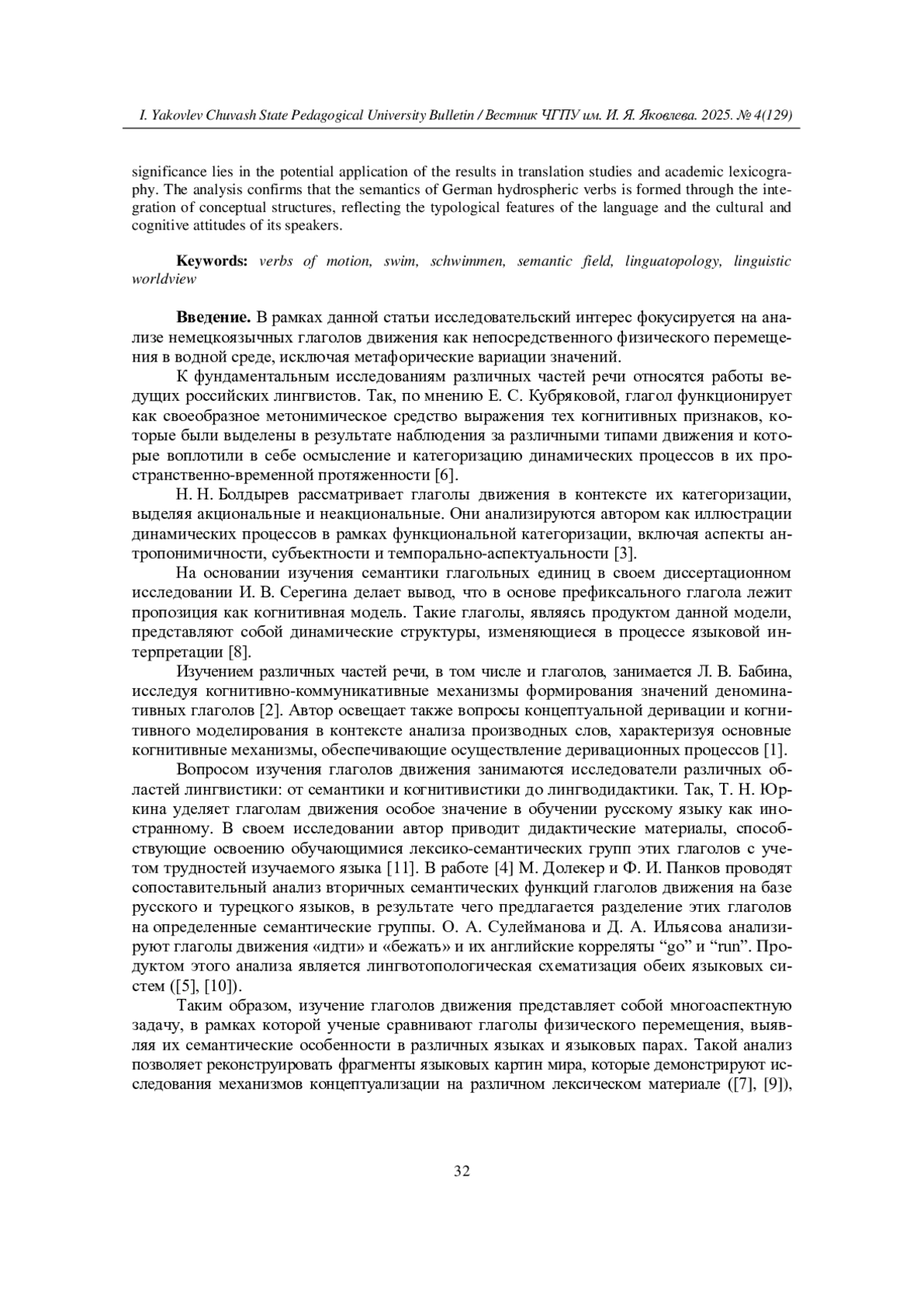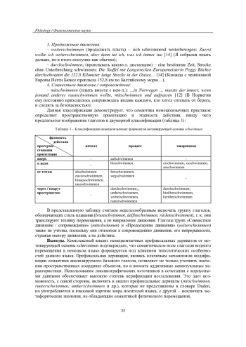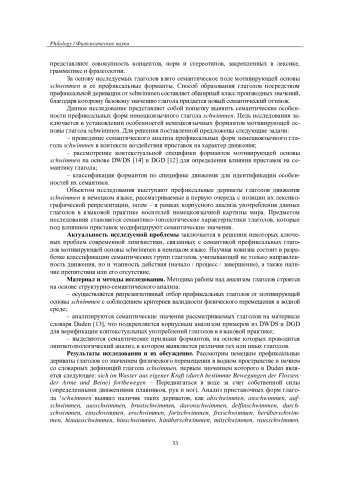 Настоящая работа посвящена анализу немецкоязычных глаголов со значением физического перемещения в водной среде (гидросфере), а именно префиксальных дериватах мотивирующей основы schwimmen. Актуальность исследования обусловлена необходимостью применения системного подхода к описанию семантики глаголов движения в рамках когнитивно-дискурсивной парадигмы. В соответствии с этим подходом анализ формирования значения производного глагола проводится на концептуальном уровне с использованием категориального аппарата когнитивной лингвистики, что предполагает обращение к концептуальным структурам, стоящим за префиксом и глагольной основой. Эмпирическую базу составили 28 дериватов. В качестве материалов привлечены данные авторитетных толковых словарей и языковых корпусов DWDS и DGD. Теоретическую основу работы составляют исследования в области семантики, лингвотопологии и теории концептуальной деривации. Новизна исследования заключается в комплексном анализе производных глагола schwimmen, сочетающем лингвотопологический подход с моделированием взаимодействия концептов префикса и основы. Практическая значимость состоит в возможности применения результатов в переводоведении и учебной лексикографии. Анализ подтверждает, что семантика немецких гидросферных глаголов формируется как результат интеграции концептуальных структур, отражая типологические особенности языка и культурно-когнитивные установки носителей.
