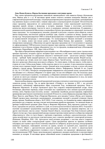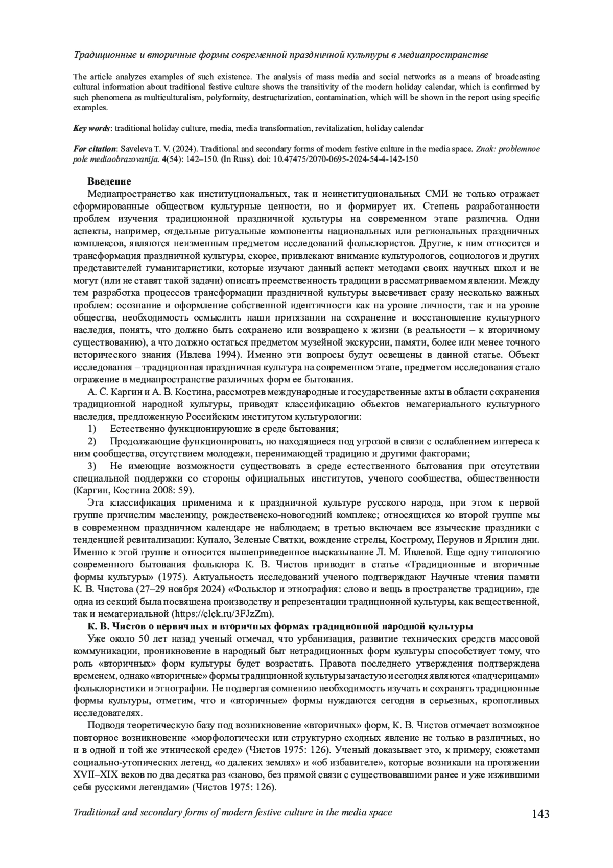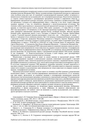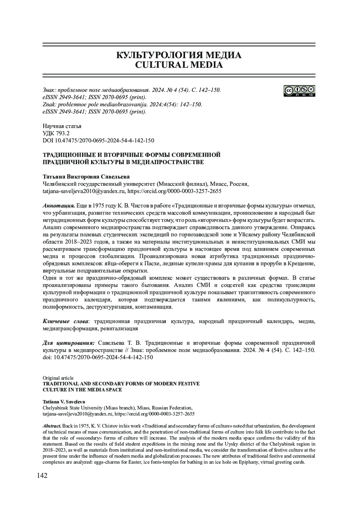 Еще в 1975 году К. В. Чистов в работе «Традиционные и вторичные формы культуры» отмечал, что урбанизация, развитие технических средств массовой коммуникации, проникновение в народный быт нетрадиционных форм культуры способствует тому, что роль «вторичных» форм культуры будет возрастать. Анализ современного медиапространства подтверждает справедливость данного утверждение. Опираясь на результаты полевых студенческих экспедиций по горнозаводской зоне и Уйскому району Челябинской области 2018-2023 годов, а также на материалы институциональных и неинституциональных СМИ мы рассматриваем трансформацию праздничной культуры в настоящее время под влиянием современных медиа и процессов глобализации. Проанализирована новая атрибутика традиционных празднично-обрядовых комплексов: яйца-обереги к Пасхе, ледяные купели-храмы для купания в проруби в Крещение, виртуальные поздравительные открытки. Один и тот же празднично-обрядовый комплекс может существовать в различных формах. В статье проанализированы примеры такого бытования. Анализ СМИ и соцсетей как средства трансляции культурной информации о традиционной праздничной культуре показывает транзитивность современного праздничного календаря, которая подтверждается такими явлениями, как поликультурность, полиформность, деструктуризация, контаминация.