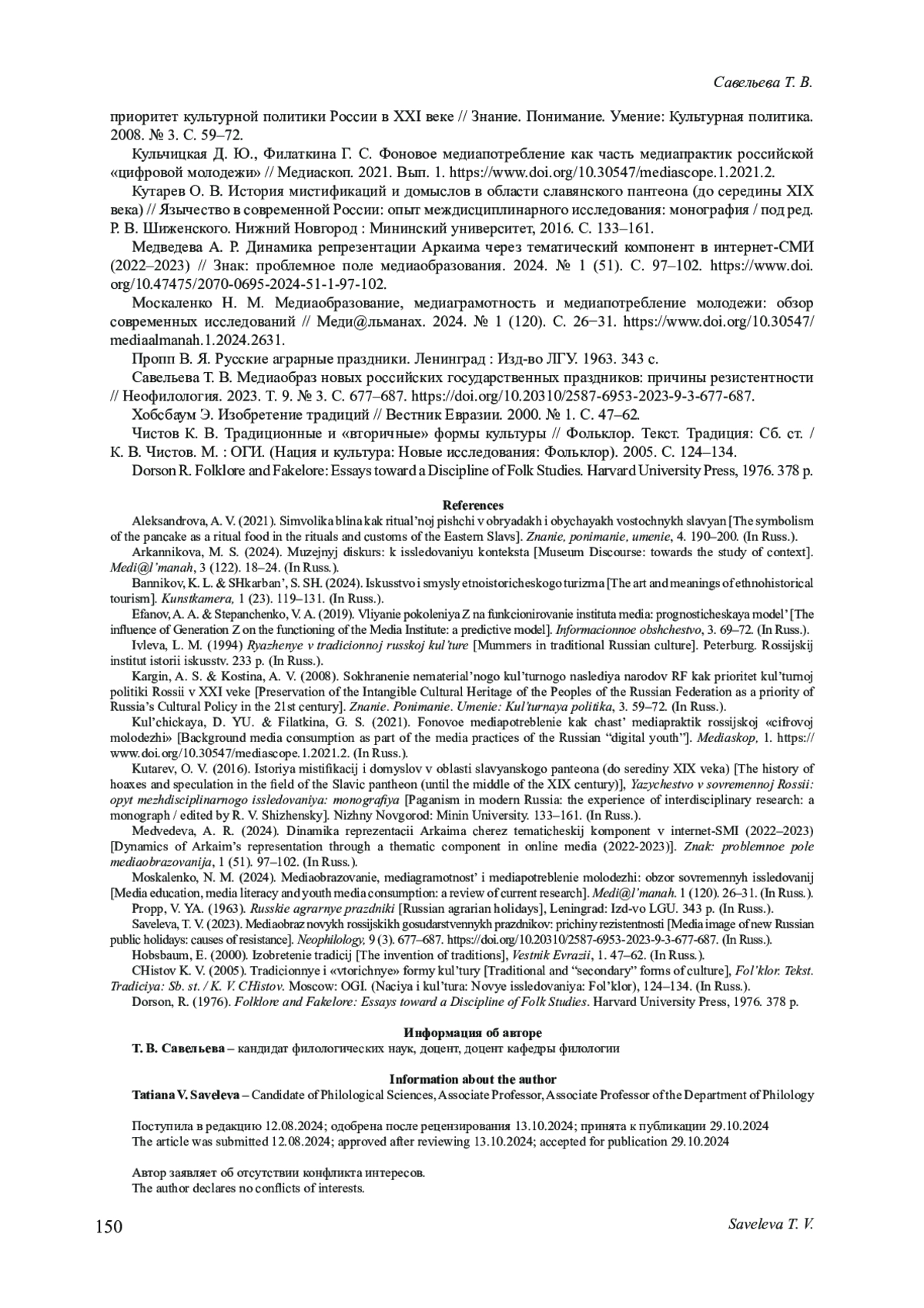 12. Савельева Т. В. Медиаобраз новых российских государственных праздников: причины резистентности // Неофилология. 2023. Т. 9. № 3. С. 677-687. DOI: 10.20310/2587-6953-2023-9-3-677-687 EDN: LTTZKL