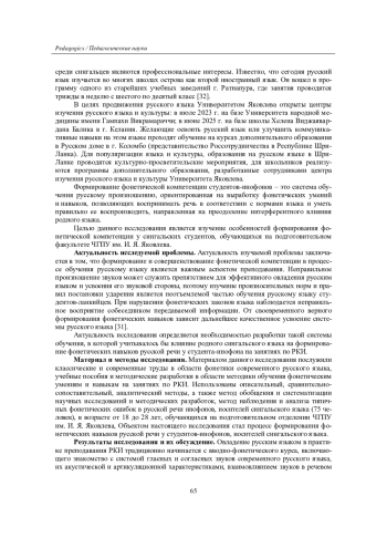 Развитие и совершенствование фонетических навыков критически важно, поскольку некорректное произношение препятствует эффективному усвоению языка и может стать причиной коммуникативных неудач. Проведенное исследование направлено на разработку такой системы обучения, которая учитывает влияние родного сингальского языка на формирование фонетических навыков русской речи у студентов-инофонов. Исследование, объектом которого стал процесс формирования фонетических навыков русской речи у носителей сингальского языка, основывалось на анализе классических и современных трудов по фонетике русского языка и методике преподавания РКИ, учебных пособий и методических разработок. Применялись описательный, сравнительно-сопоставительный, аналитический методы, а также обобщение, систематизация научных исследований и наблюдение за типичными фонетическими ошибками у сингальских студентов.