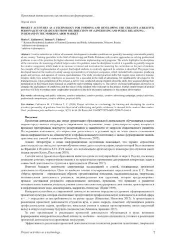 Креативные индустрии как драйвер экономического развития в современных условиях в целом становятся устойчивым приоритетом нашей страны. Подготовка специалистов по направлению «Реклама и связи с общественностью», владеющих креативными подходами при решении профессиональных задач, является одним из приоритетов для высших учебных заведений, занимающихся реализацией таких программ. В статье выделены дисциплины учебного плана, освоение которых помогает решить эту задачу; отмечены дисциплины, в которые можно интегрировать креативную составляющую частично, что ведет к повышению интереса и мотивации к освоению учебной программы со стороны студентов. Описан пример реализации проекта, который помог студентам креативно подойти к его решению. Проект разработан на основании результатов проведенного исследования среди представителей компаний работодателей, куда вошли как компании, производящие товары и услуги, так и агентства различной специализации. Исследование выявило практические навыки, требующие более усиленной подготовки. Креативные навыки были отмечены работодателями как необходимые для специалиста в области рекламы, но недостаточно развитые в процессе обучения. По завершении проекта был проведен опрос среди студентов о том, какие навыки они приобрели в процессе участия в нем. Многие отметили креатив и все, что с этим связано. Опрос участников проекта позволил сопоставить ожидания работодателей и видение студентов, принявших участие в проекте. Дальнейшее совершенствование проектной деятельности поможет выпускать более востребованных на современном рынке труда специалистов в области креативных индустрий.