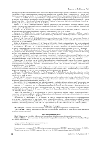 2. Акунина Ю. А. Стратегические направления развития системы профессиональной подготовки специалистов в сфере креативных индустрий // Вузы культуры и искусств в международном гуманитарном сотрудничестве: глобальные вызовы и стратегия действий: Сборник статей Международного конгресса, Москва, 14-16 сентября 2023 года. Москва: Московский государственный институт культуры, 2023. С. 140-146. EDN: BKNPEE