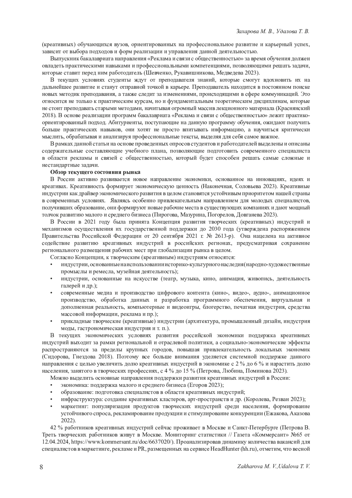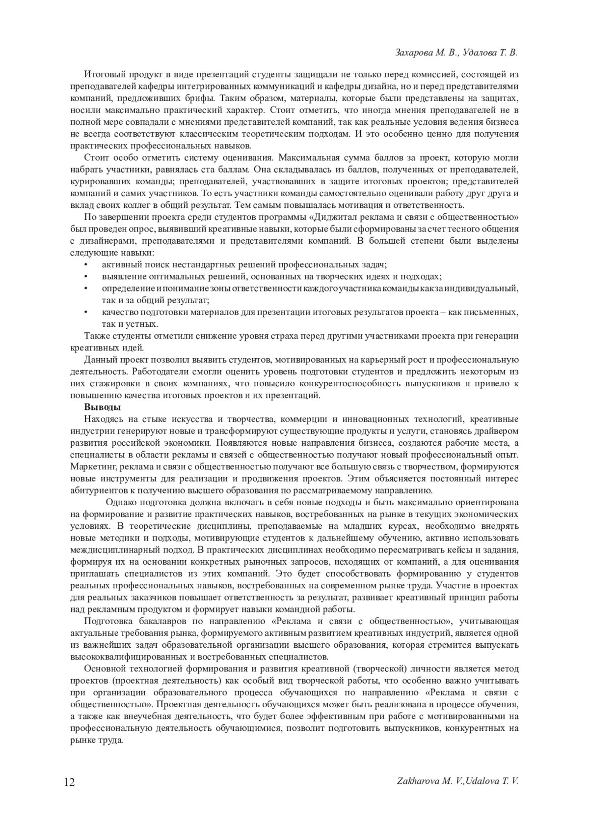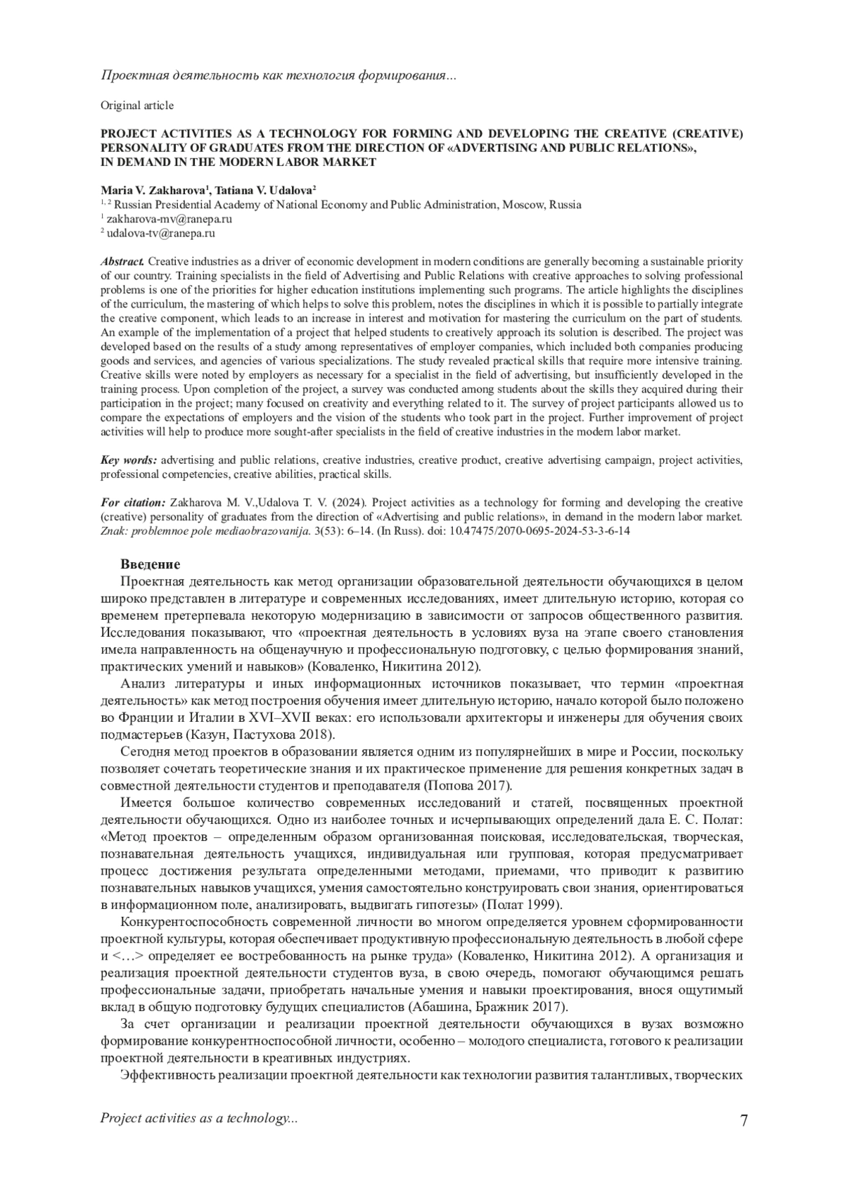 6. Захарова М. В. Развитие креативных навыков при подготовке бакалавров по направлению “Реклама и связи с общественностью” // Динамика медиасистем. 2024. Т. 4, № 1. С. 166-174. EDN: QXNUBT