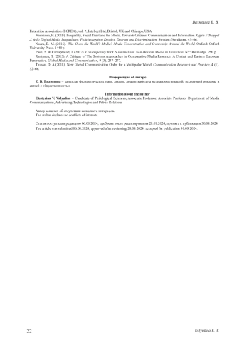 8. Урина Н. В. История и современные тенденции развития медиасистем стран БРИКС // Международная жизнь. 2019. № 11. С. 136-137. EDN: YOOKVL
