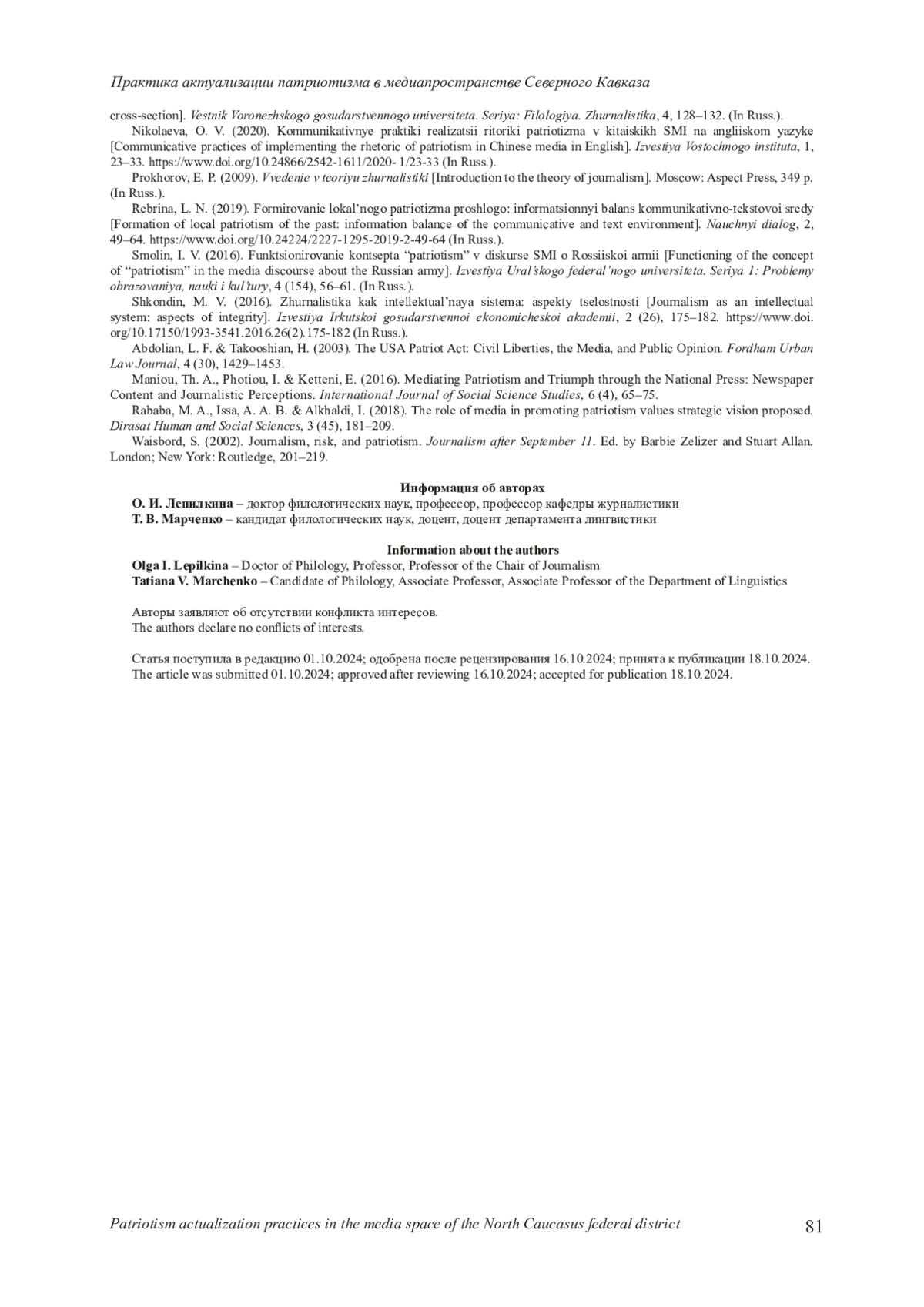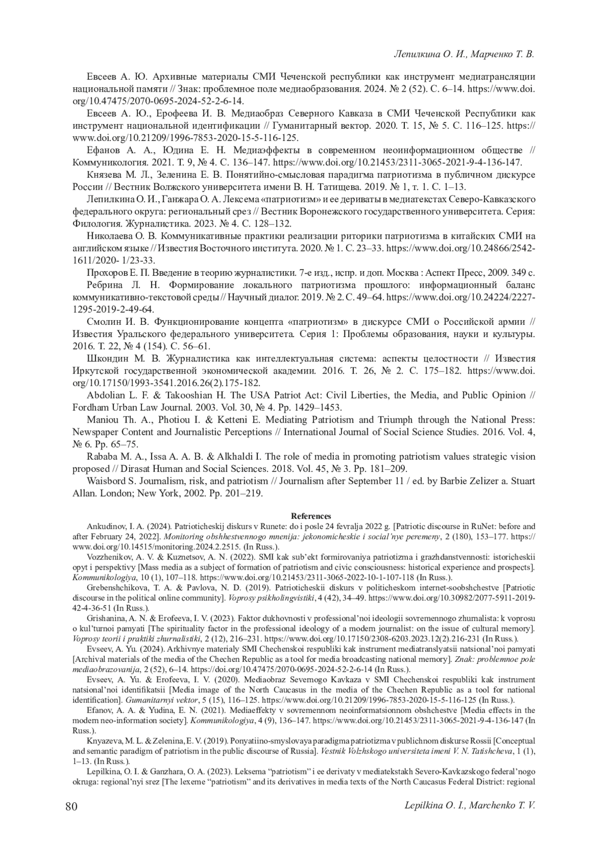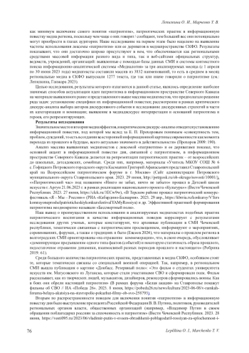 9. Лепилкина О. И., Ганжара О. А. Лексема “патриотизм” и ее дериваты в медиатекстах Северо-Кавказского федерального округа: региональный срез // Вестник Воронежского государственного университета. Серия: Филология. Журналистика. 2023. № 4. С. 128-132. EDN: AYWUAO