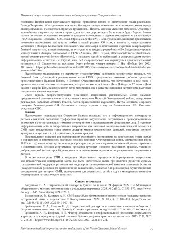 1. Анкудинов И. А. Патриотический дискурс в Рунете: до и после 24 февраля 2022 г. // Мониторинг общественного мнения: экономические и социальные перемены. 2024. № 2 (180). С. 153-177. https://www.. DOI: 10.14515/monitoring.2024.2.2515 EDN: LLUFIU