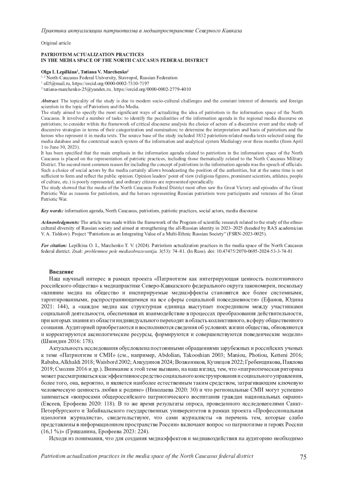 Актуальность исследования обусловлена современными социокультурными вызовами и постоянным интересом отечественных и зарубежных ученых к теме «Патриотизм и СМИ». Целью исследования, результаты которого излагаются в данной статье, являлось определение наиболее значимых способов актуализации идеи патриотизма в информационном пространстве Северного Кавказа, что предполагало решение ряда задач: установление специфики информационной повестки в региональном медиадискурсе о патриотизме; рассмотрение в рамках критического дискурс-анализа выбора акторов дискурсивного события и исследование дискурсивных стратегий в части их категоризации и номинации; выявление в медиатекстах интерпретации и оснований патриотизма и героев, репрезентирующих его. Источниковую базу исследования составили выявленные с помощью базы данных СМИ и системы контекстного поиска информационно-аналитической системы «Медиалогия» за три месяца (с 1 апреля по 30 июня 2023 года) 3832 медиатекста, где так или иначе говорили о патриотизме. Установлено, что основной акцент в информационной повестке дня, связанной с патриотизмом, в информационном пространстве Северного Кавказа делается на репрезентации патриотических практик, в том числе тематически связанных с СВО. Вторым по распространенности поводом для включения понятия«патриотизм» в информационную повестку дня было выступление официальных лиц. Подобный выбор средствами массовой информации социальных акторов, безусловно, позволяет транслировать позицию власти, но в то же время не вполне достаточен для формирования и отражения общественного мнения. Мало представлена точка зрения лидеров мнения (религиозных деятелей, известных ученых, спортсменов, деятелей культуры и искусства и т. д.), единично - рядовых граждан. Исследование показало, что медиа СКФО чаще всего видели основаниями для патриотизма Великую Победу и эпизоды Великой Отечественной войны, а героями, репрезентирующими российский патриотизм, соответственно, называли участников и ветеранов Великой Отечественной войны.