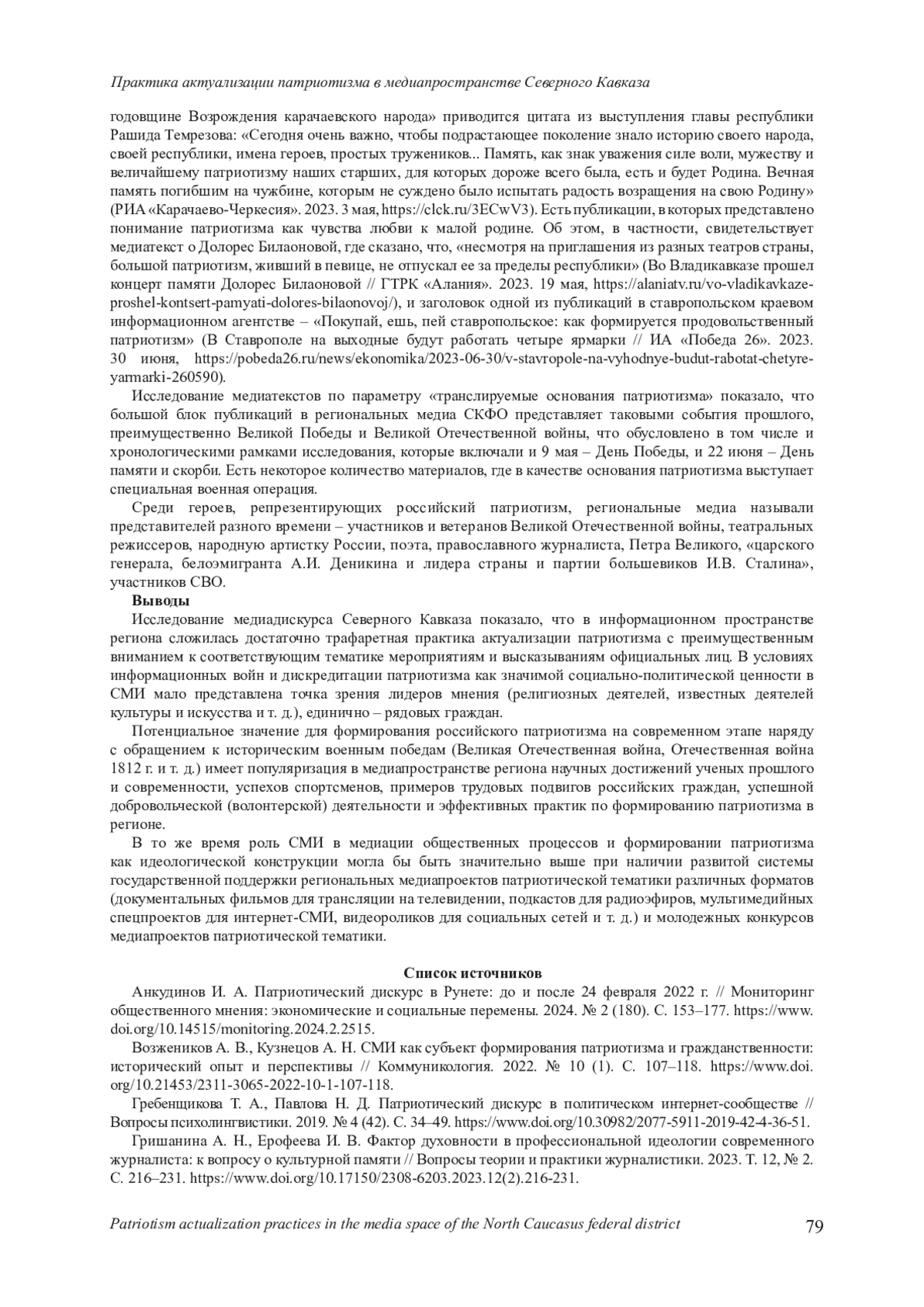 2. Возжеников А. В., Кузнецов А. Н. СМИ как субъект формирования патриотизма и гражданственности: исторический опыт и перспективы // Коммуникология. 2022. № 10 (1). С. 107-118. https://www.. DOI: 10.21453/2311-3065-2022-10-1-107-118 EDN: BYYLXT
