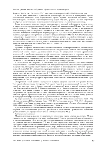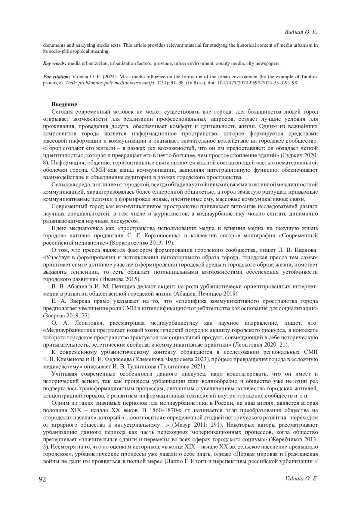 Статья посвящена проблемам влияния медийной сферы на урбанистические процессы. Цель статьи - проанализировать, как средства массовой информации стали важным фактором формирования городской среды и новых поведенческих практик, определивших культурный облик российского общества в ХХ веке. В исследовании рассматривается исторический контекст медиаурбанистики, освещается влияние частных изданий уездного провинциального города на формирование нового типа современного общества - индустриального. В статье выделены элементы коммуникативно-информационной инфраструктуры, которые являются атрибутами городской жизни и влияют на развитие массово-коммуникативной среды, обеспечивая функционирование медиасистемы. Также сделаны выводы о том, что зарождающиеся городские средства массовой информации сыграли важную роль в развитии социальной и культурной среды российской провинции. Материалом исследования стала пресса Тамбовской губернии в первые два десятилетия ХХ века, в период активного становления частной периодики в больших и малых городах российской провинции. Рассмотрены примеры из социальной, культурной, образовательной сфер жизнедеятельности региона, отраженные на страницах дореволюционной периодики. В работе использовались общенаучные и специальные методы, например, сравнительно-исторический и проблемно-хронологический, а также методы изучения архивных документов и анализа текстов средств массовой информации. Данная статья формирует актуальный материал для изучения исторического содержания медиаурбанистики в ее социально-философском значении.