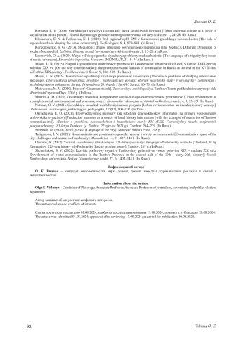 12. Леонтович О. А. Языкбольшого города: ключевые проблемы медиаурбанистики//Этнопсихолингвистика. М.: ИНИОН РАН. 2020. № 3. С. 19-34. EDN: TLRNAU