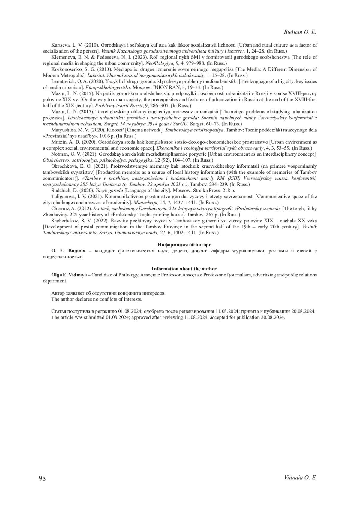 3. Видная О. Е. Специфика становления системы региональной печати в начале ХХ века (на примере Тамбовской области) // Неофилология. 2022. Т. 8, № 4. С. 796-805. EDN: XCEYPZ