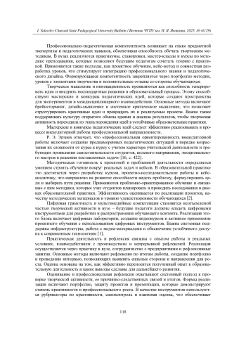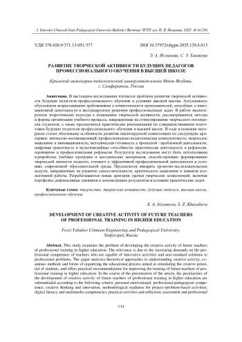 В настоящем исследовании изучается проблема развития творческой активности будущих педагогов профессионального обучения в условиях высшей школы. Актуальность обусловлена возрастающими требованиями к компетентности преподавателей, способных к инновационной деятельности и нестандартному решению профессиональных задач. В работе анализируются теоретические подходы к пониманию творческой активности, рассматриваются методы и формы организации учебного процесса, направленные на стимулирование творческого потенциала студентов, а также предлагаются практические рекомендации по совершенствованию подготовки будущих педагогов профессионального обучения в высшей школе. В ходе изложения материала статьи обоснованы особенности развития анализируемой компетенции по следующим критериям: личностно-мотивационный; профессионально-педагогическая компетентность; творческое мышление и инновационность; методическая готовность к проектной / проблемной деятельности; цифровая грамотность и мультимедийные способности; практическая деятельность и рефлексия; оценивание и профессиональная рефлексия. Результаты исследования могут быть использованы в разработке учебных программ и методических материалов, способствующих формированию творческой личности педагога, готового к эффективной профессиональной деятельности в условиях современной образовательной среды. Предлагается внедрять проектно-исследовательские модули, направленные на развитие самостоятельности, критического мышления и навыков коллективной работы. Разрабатываются новые критерии оценки творческих компетенций, включая портфолио, рефлексивные дневники и демонстрацию результатов в условиях практических задач.