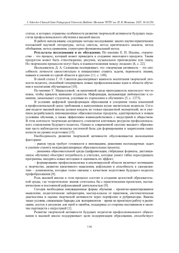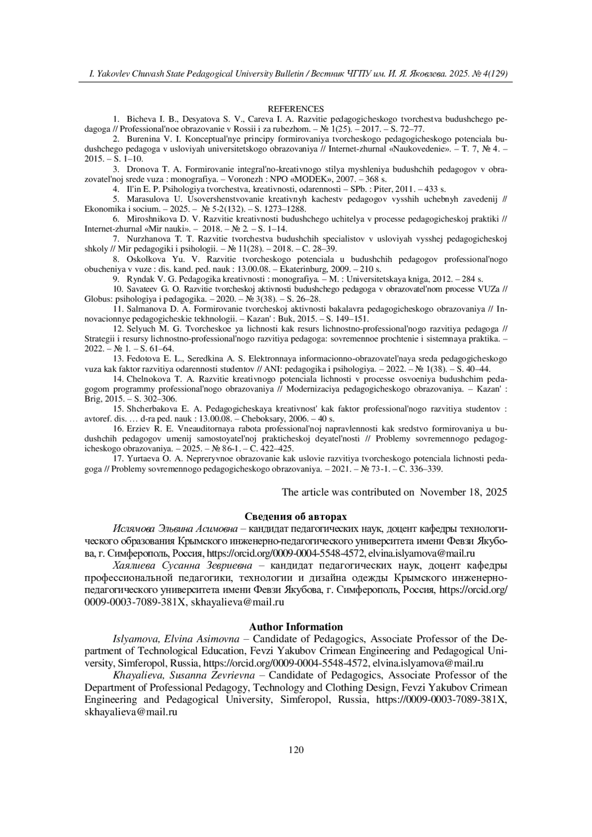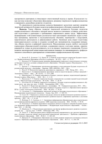 5. Марасулова У. Усовершенствование креативных качеств педагогов высших учебных заведений // Экономика и социум. - 2025. - № 5-2(132). - С. 1273-1288.