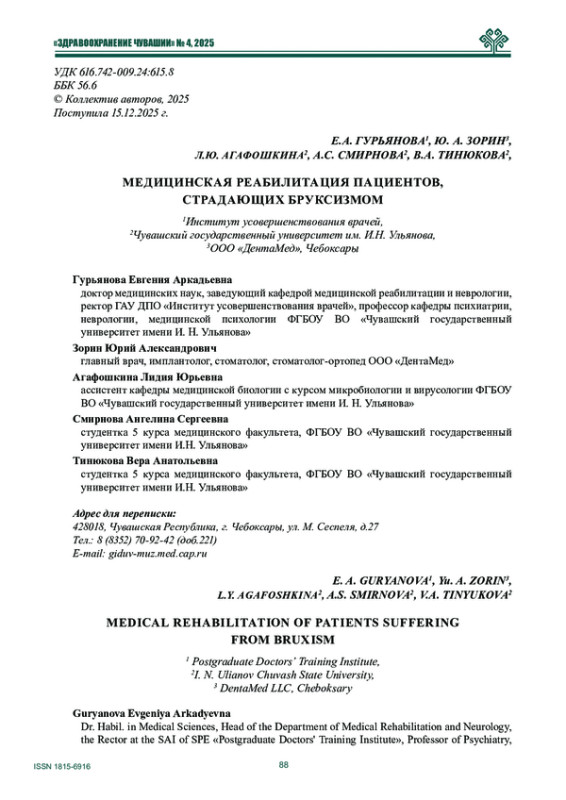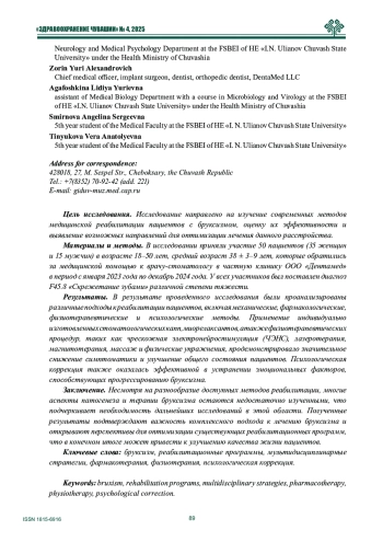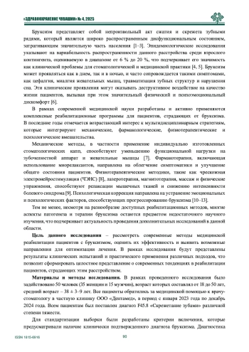 Цель исследования. Исследование направлено на изучение современных методов медицинской реабилитации пациентов с бруксизмом, оценку их эффективности и выявление возможных направлений для оптимизации лечения данного расстройства.