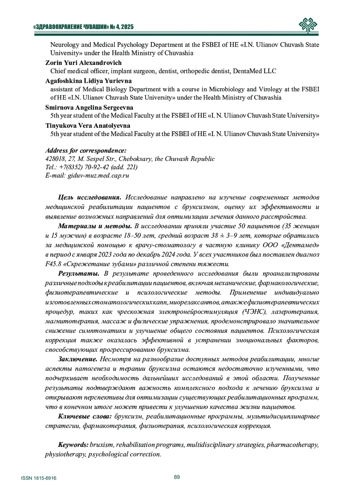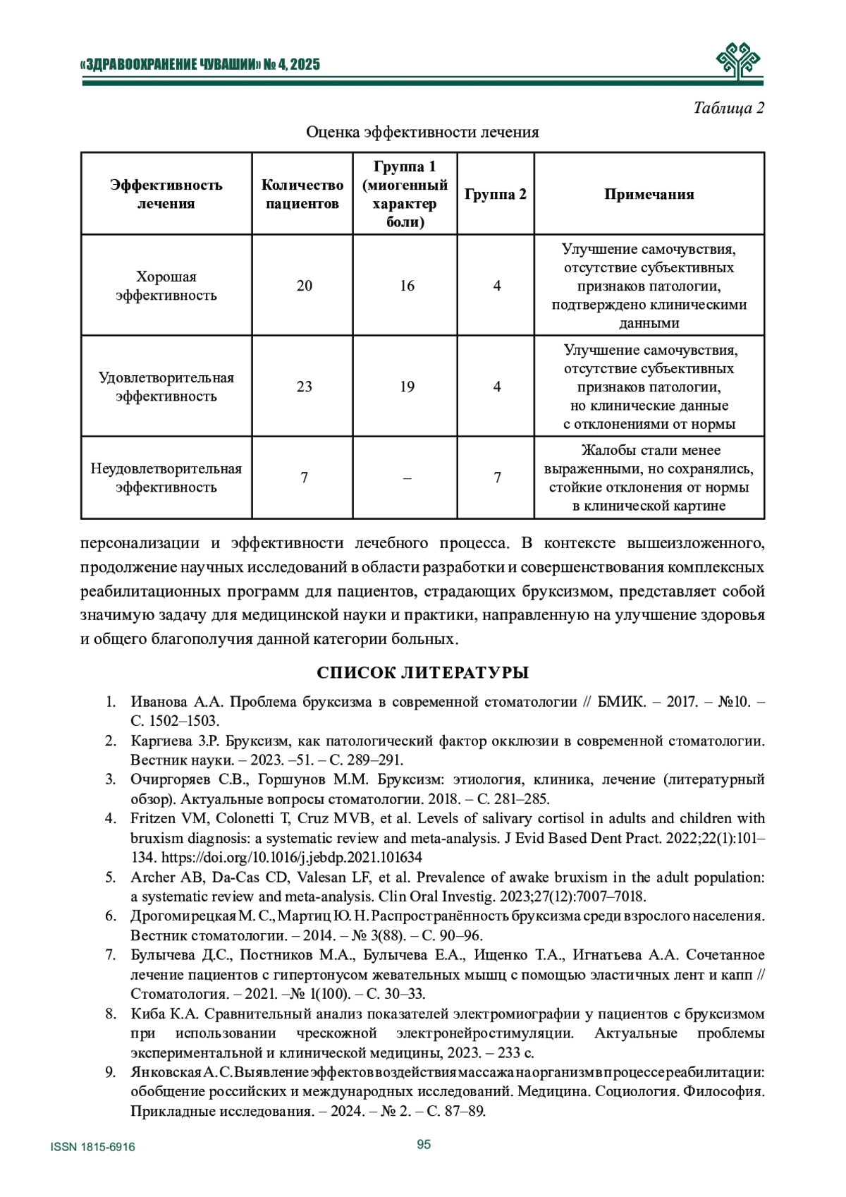 7. Булычева Д.С., Постников М.А., Булычева Е.А., Ищенко Т.А., Игнатьева А.А. Сочетанное лечение пациентов с гипертонусом жевательных мышц с помощью эластичных лент и капп // Стоматология. - 2021. -№ 1(100). - С. 30-33.