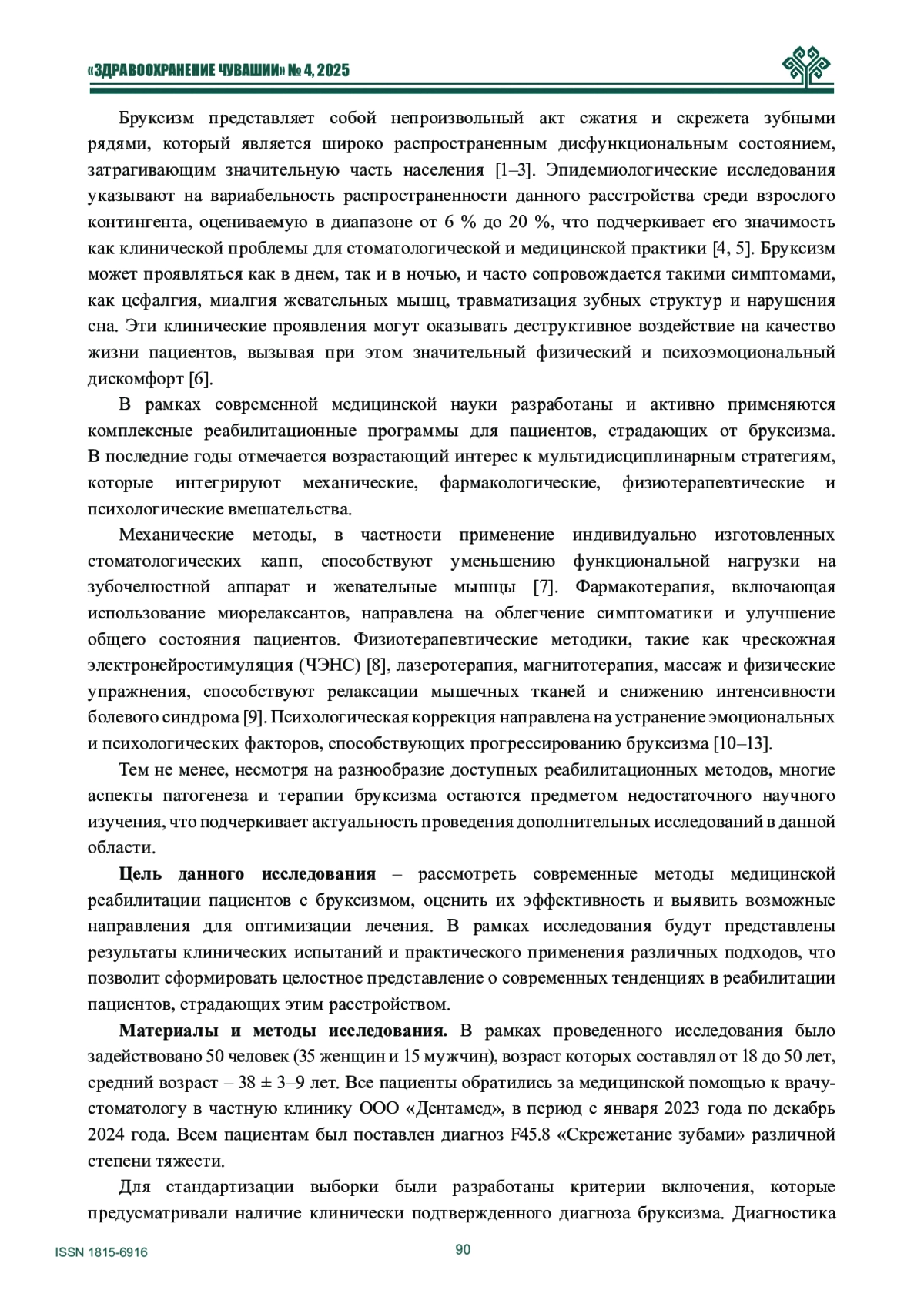 Бруксизм представляет собой непроизвольный акт сжатия и скрежета зубными рядями, который является широко распространенным дисфункциональным состоянием, затрагивающим значительную часть населения [1–3]. Эпидемиологические исследования указывают на вариабельность распространенности данного расстройства среди взрослого контингента, оцениваемую в диапазоне от 6 % до 20 %, что подчеркивает его значимость как клинической проблемы для стоматологической и медицинской практики [4, 5]. Бруксизм может проявляться как в днем, так и в ночью, и часто сопровождается такими симптомами, как цефалгия, миалгия жевательных мышц, травматизация зубных структур и нарушения сна. Эти клинические проявления могут оказывать деструктивное воздействие на качество жизни пациентов, вызывая при этом значительный физический и психоэмоциональный дискомфорт [6].
