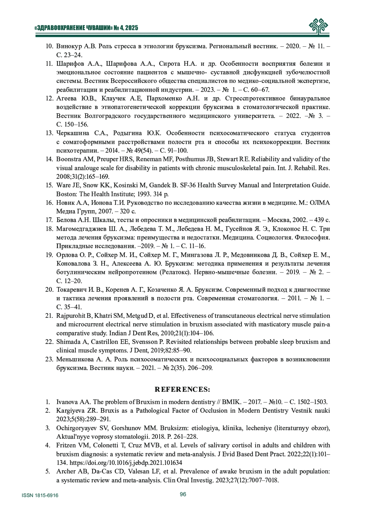 23. Меньшикова А. А. Роль психосоматических и психосоциальных факторов в возникновении бруксизма. Вестник науки. - 2021. - № 2(35). 206-209.