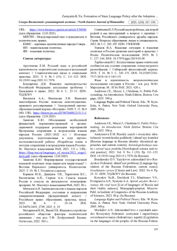 2. Арутюнова Е.М. Русский язык в российской идентичности: теоретические подходы и актуальный контекст // Социологическая наука и социальная практика. 2021. Т. 9. № 1 (33). С. 111-123. DOI: 10.19181/snsp.2021.9.1.7876 EDN: YZKGMB