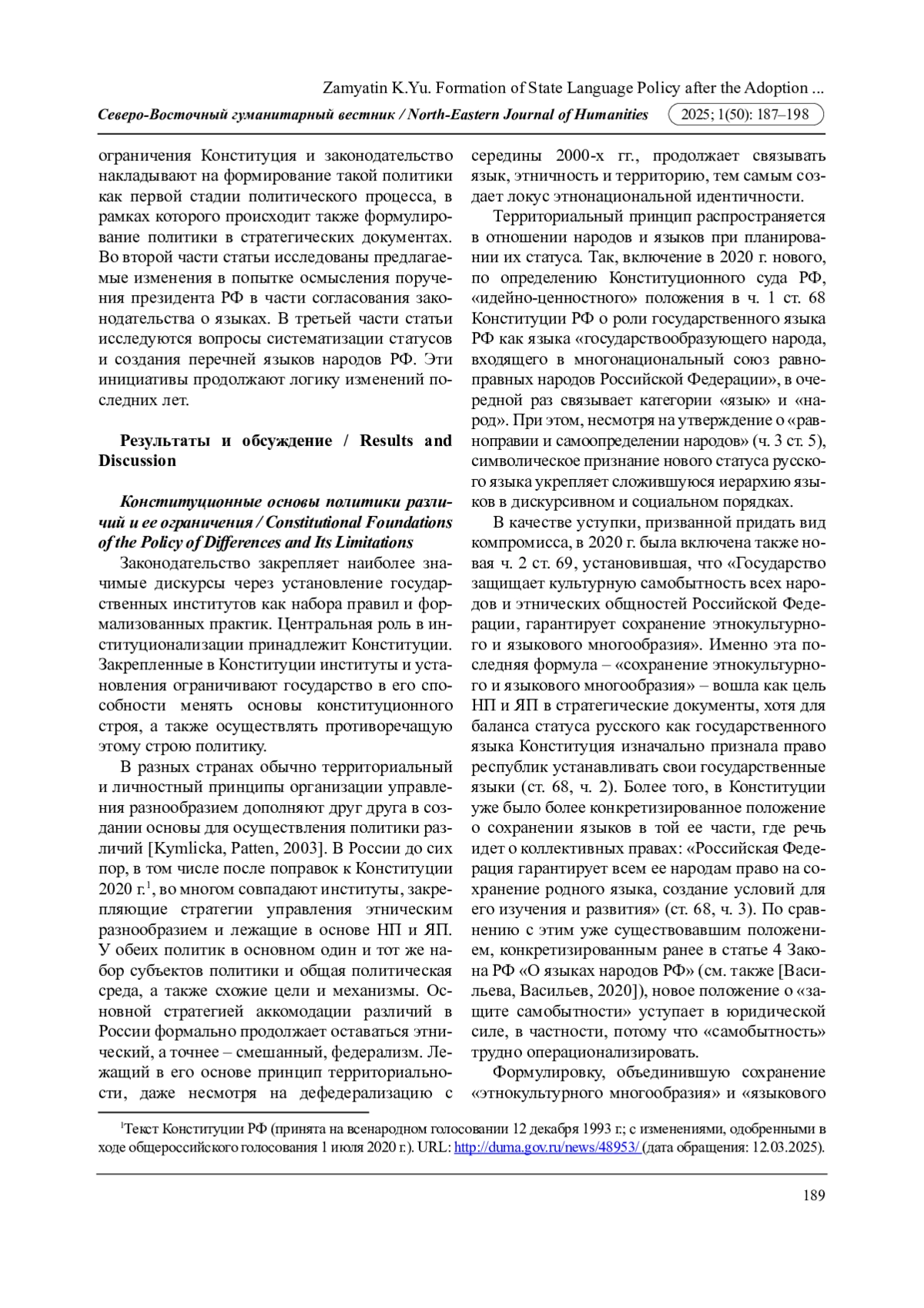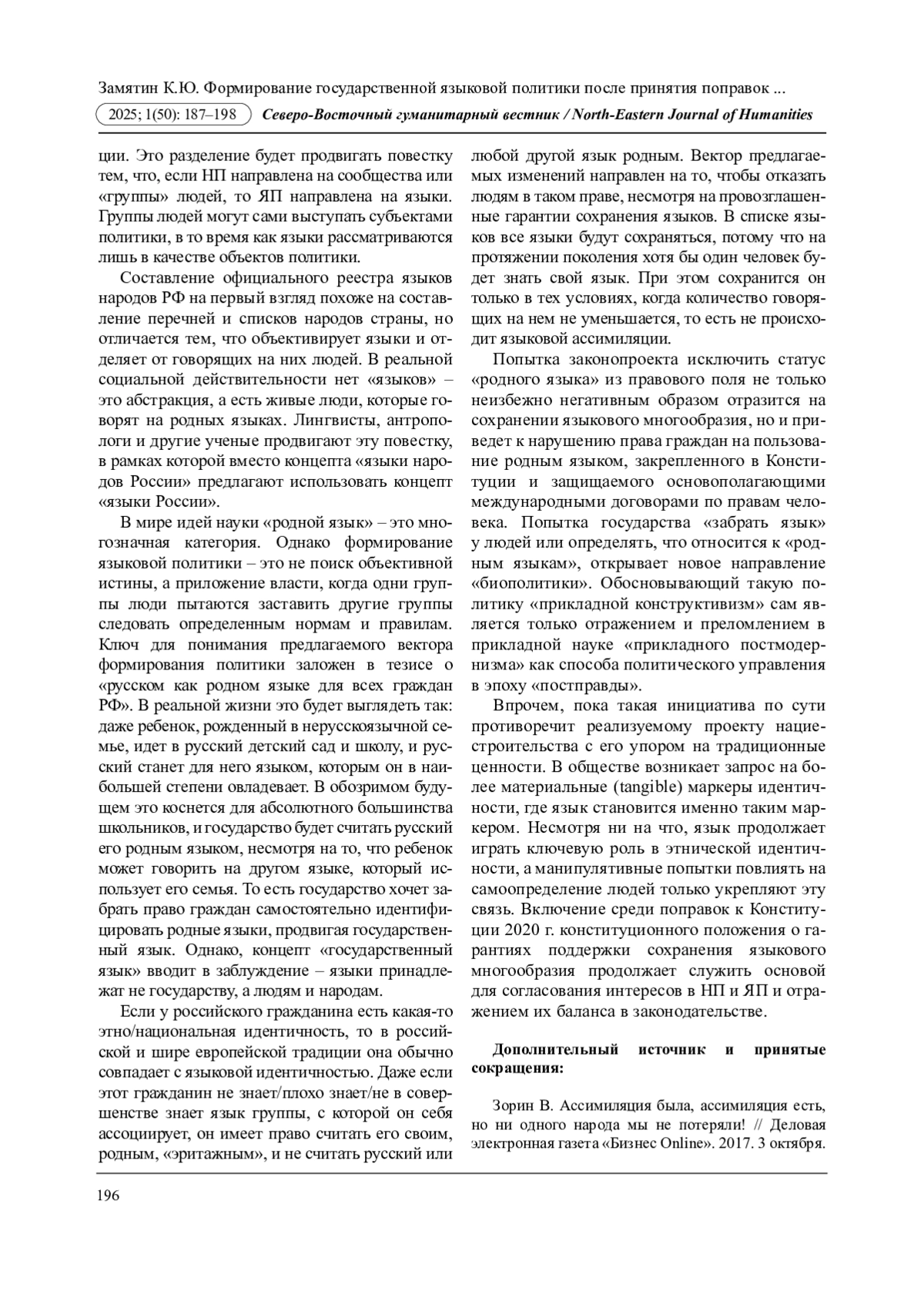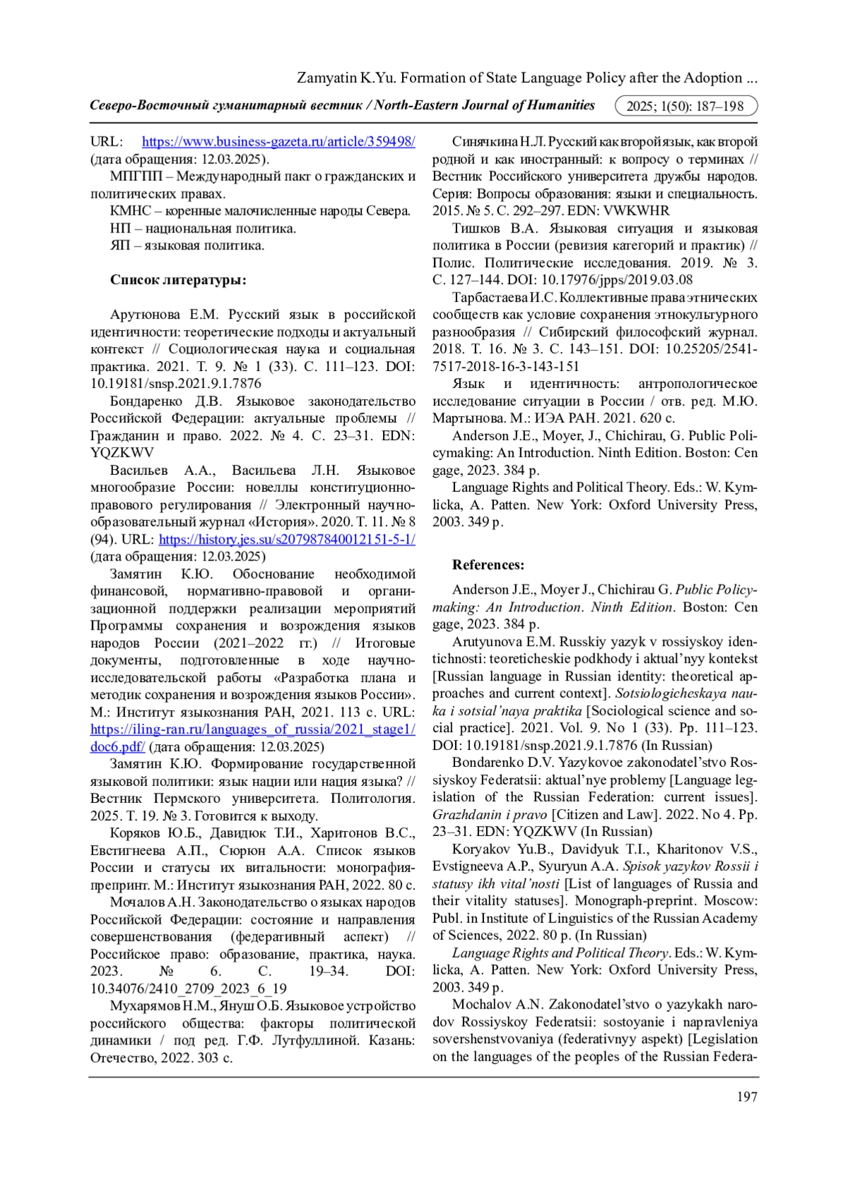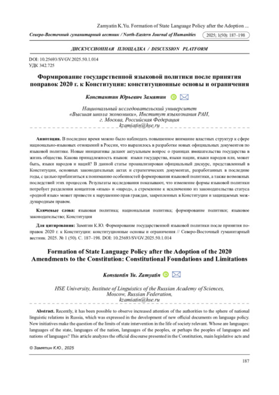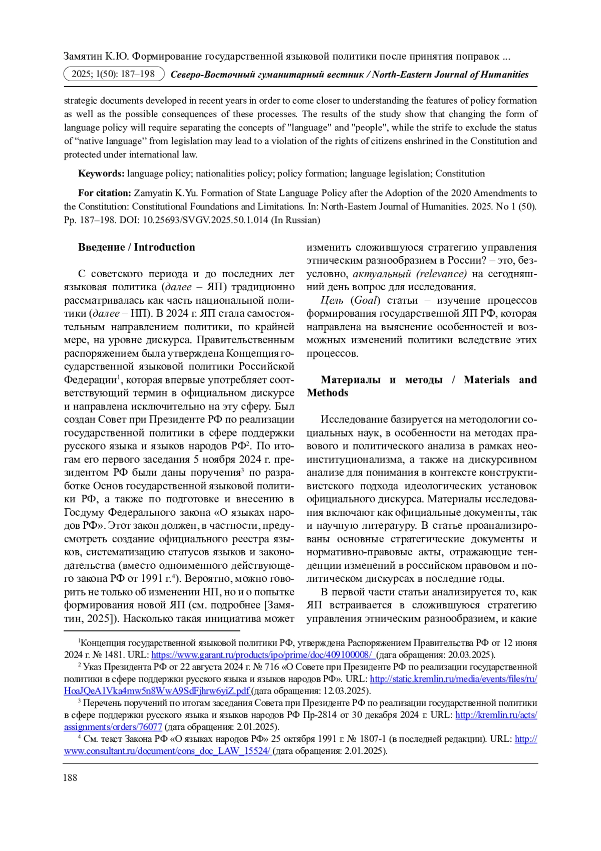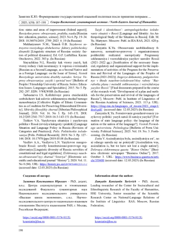 6. Замятин К.Ю. Формирование государственной языковой политики: язык нации или нация языка? // Вестник Пермского университета. Политология. 2025. Т. 19. № 3. Готовится к выходу.